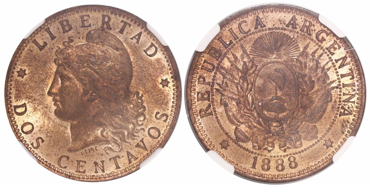 Argentina, copper 2 centavos, 1888, high final 8, encapsulated NGC MS 62 RB. Nearly prooflike with luster on fields and darker, satiny details, scarce date, second highest grade in NGC census (below just two at MS 64).