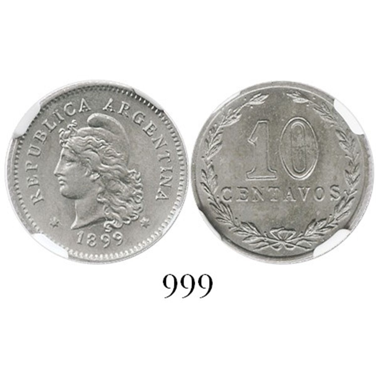 Argentina, copper-nickel 10 centavos, 1899 encapsulated NGC MS 62. Janson-93.1; KM-35. Lustrous and very lightly rainbow-toned. Priced at $200 in UNC in new Janson reference.