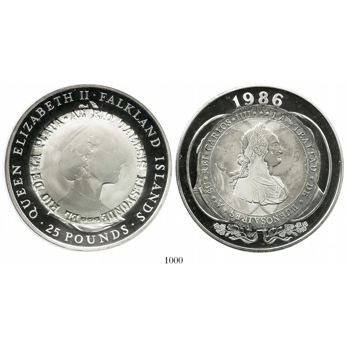 Argentina, silver medal, made from a Falkland Islands 25 pounds, Elizabeth II, 1986, overstruck in center with original obverse die for Argentina (Buenos Aires) Charles IV medal of 1808 and separately stamped on the other side with EL RIO DE LA PLATA AL RIO TAMESIS RESPONDE… ("the Plate River responds to the Thames River..."), very rare (only 17 made). 151.1 grams. Very strange and interesting item made by prominent Argentinean numismatist Carlos Janson, who owned the original obverse die for the 1808 medal and used it to mutilate a large British bullion coin in response to the Falkland War between Great Britain and Argentina in 1982 (only 15 of the 17 he made were released to the market). The original 1808 medal itself is very rare and famous, made by designer Arrabal, with the bust of the king on the obverse and the reverse showing a lion holding a Spanish flag over an English flag, in reference to the defeat of the English during their unsuccessful invasion of the Rio de la Plata area in 1806-7 during the Napoleonic Wars. Only 12 pieces of the first design were made, in Chile, which was deemed too few, whereupon the Cabildo in Buenos Aires commissioned a new design with that city's name in the obverse legend (as we see here), of which only 25 were made. Yet a third design changed the obverse legend to what we see on the other side of the Janson piece (EL RIO DE LA PLATA AL RIO TAMESIS RESPONDE...). Of further interest is the fact that the British consul of 1824-32, Sir Woodbine Parish, acquired as many of the 1808 medals as he could and brought them back to England, where they were probably melted. Housed in original Royal Mint box with card.