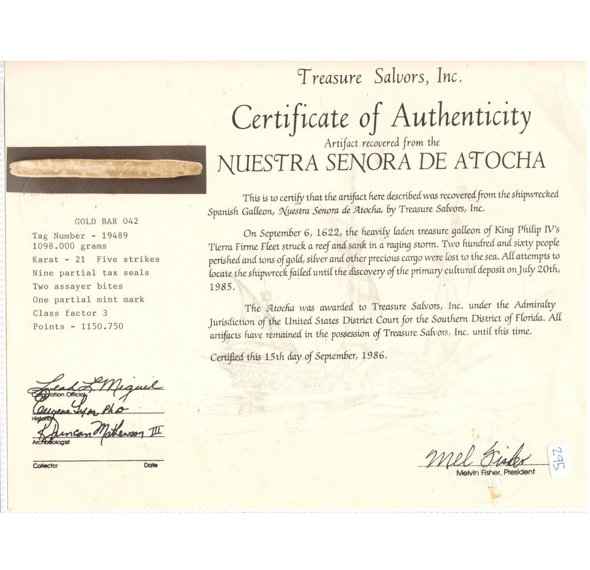 Complete Colombian gold bar #42, 1098 grams, marked with foundry/assayer SARGOSA / PECARTA and fineness XXI (21K), from the Atocha (1622). 11" x 1" x 1/2". Impressively long and uncut, but about half the thickness of the last lot, with flat top and bottom, sloping sides, somewhat rough texture except for the top, which is marked with fineness five times, rectangular foundry/assayer cartouche (weak in center, stronger on sides) and TEN partial (circular, dot-bordered) tax stamps, crude cylindrical assayer's bites at both ends, small spots of coral in just two places. The SARGOSA / PECARTA cartouche refers to the gold mine (foundry) at Zaragoza, Colombia, and an assayer (or similar official) whose exact name has not been determined (the letters of which were monogrammed together to make "PECARTA"). Zaragoza, on the shores of the Rio Nechi in the province of Antioquia, was home to one of the most prolific gold mines in the early 1600s, producing some 20 million pesos of gold from 1590 to 1645, and was represented by a caja real (royal treasury office) since 1582. With Fisher photo-certificate #042.