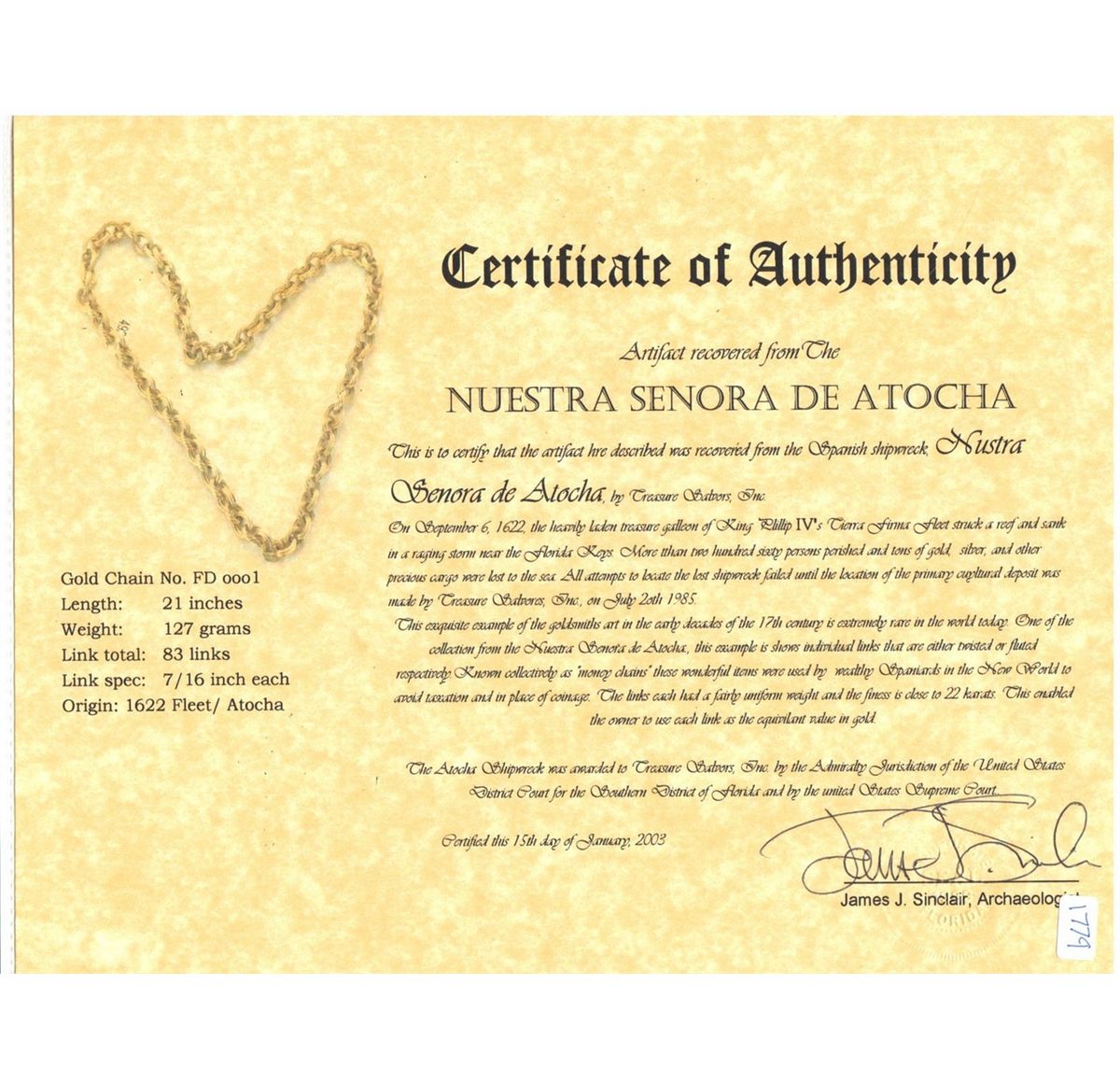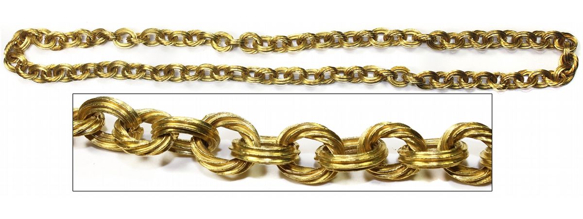 Ornate gold "money" chain necklace, 83 links, 21" long. 128.1 grams. This chain is of identical design to but twice the length of lot 138 in the original Christie's (New York) auction of 1998, which sold for $22,000. The design consists of alternating twisted and straight oval links of fluted ribs, each about 10mm, with a small gap where the link could be opened and removed, adding support to the theory that these chains were used as tax-free money by simply taking out links, each of which had the value of about a 1/2 escudo (8 reales) in its time. Thirteen of the links show fine encrustation, but otherwise the chain is pristine and sharp, with none of the wear and tear usually seen on "money" chains. For five years (2006-11) this piece was displayed by the Mel Fisher Maritime Heritage Society museum, which deemed it one of the highest-quality specimens found (see accompanying letter). For practical reasons (since it is only choker length), the previous owner had copies of the links professionally made in Key West to add 4" (17 links, a little over 25 grams total), so that the chain could fit over his head, but those replica links have been removed and will be offered without obligation to the winning bidder at current melt value, added to the hammer price. With photo-certificate #FD0001 and letter from Mel Fisher Maritime Heritage Society. Recovered from: Atocha, sunk in 1622 west of Key West, Florida