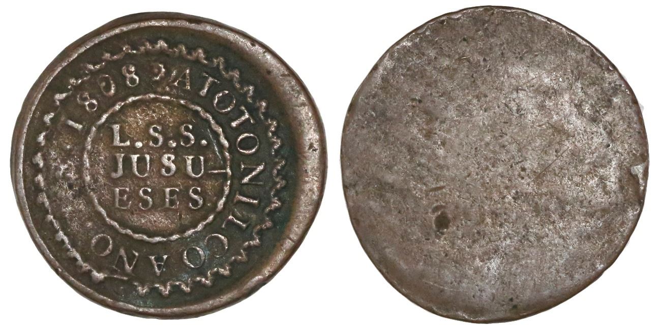 Atotonilco, Guadalajara, Mexico, copper uniface hacienda token, 1808, very scarce. 7.28 grams. Design of L.S.. / JU SU- / ESES inside ornate ring within legend ATOTONILCO ANO 1808, off-center VF with dark encrustation in part of legend.