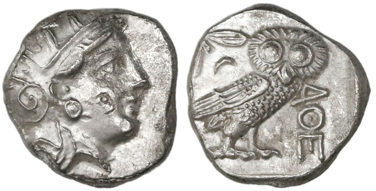 Attica, Athens, AR tetradrachm, 400-353 BC, "owl." HGC 4.. 17.01 grams. Helmeted head of Athena right, with frontal eye and pi-style palmette / Owl standing right, head facing; olive sprig and crescent behind; all within incuse square. New style, high grade (frosty AU) but with banker's mark on Athena.