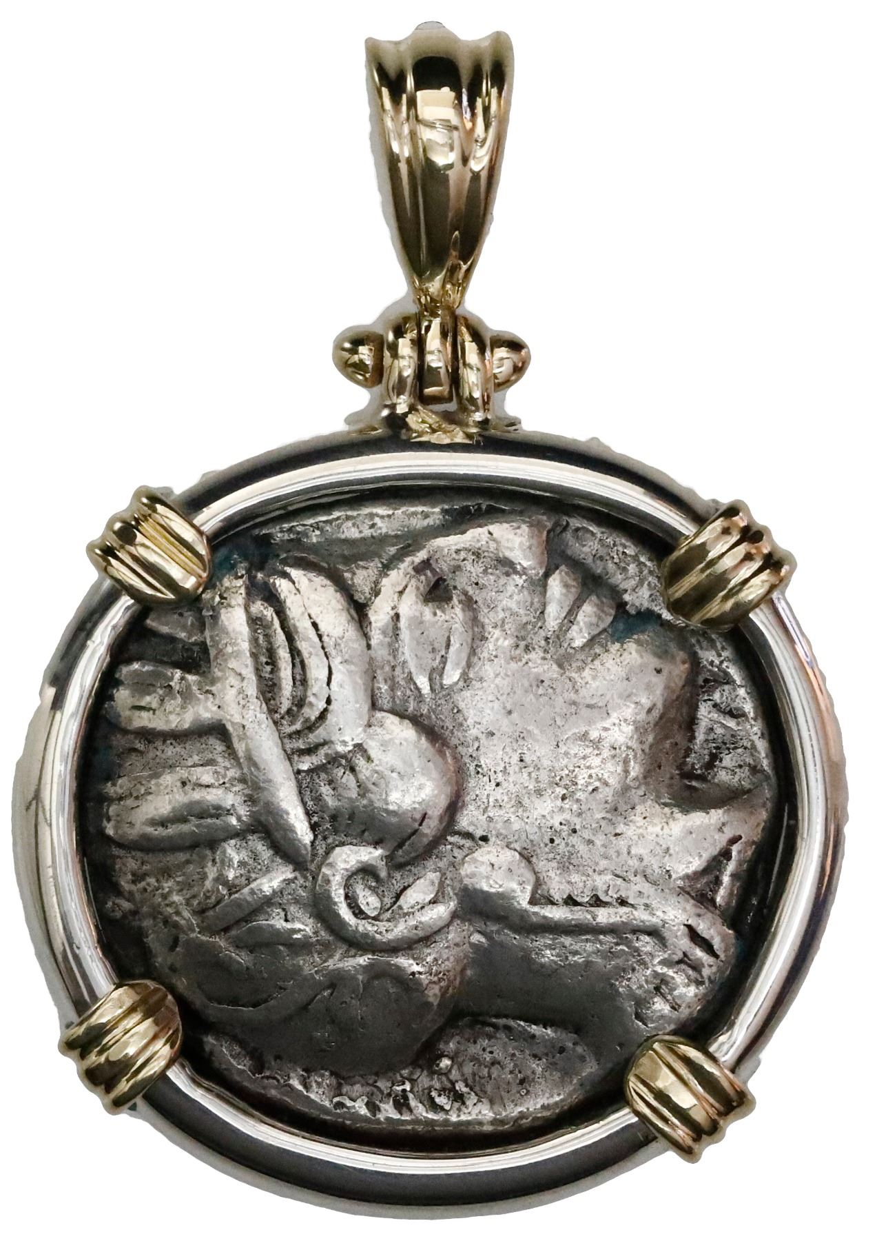 Attica, Athens, AR tetradrachm "owl," 454-404 BC, mounted owl-side out in silver bezel with 14K gold prongs and shackle bail. 25.61 grams. Helmeted head of Athena right, with frontal eye / Owl standing right, head facing; olive sprig and crescent to left; all within incuse square. Very attractive heavy-gauge custom silver bezel surrounding brightly-toned XF coin, triple-wire gold prongs and decorative gold swivel bail. With photo-certificate.