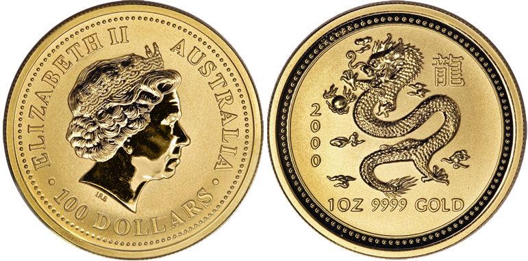 Australia, proof 1-oz bullion $100, 2000, Year of the dragon.