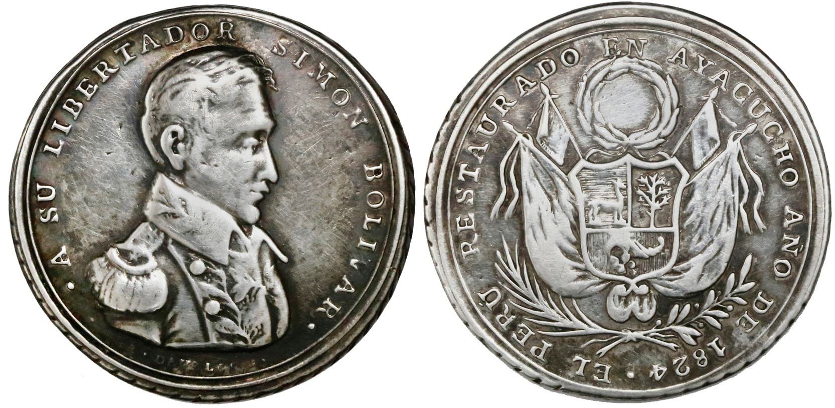 Ayacucho, Peru, silver medal, 1824 (struck 1825), Restoration of Peru in Ayacucho by Bolivar. Fonrobert-9178. 15.81 grams; 32 mm. Obverse : bust of Bolivar above A DAVALOS G (engraver) inside legend A SU LIBERTADOR SIMON BOLIVAR; reverse: arms inside legend EL PERU RESTAURADO EN AYACUCHO ANO DE 1824. Popular medal instituted by law in 1825 to commemorate the Battle of Ayacucho (1824), which finally ended Spanish rule in Peru. Polished VF with surfaces starting to tone over with a rainbow color. Pedigreed to the Cotoca collection.