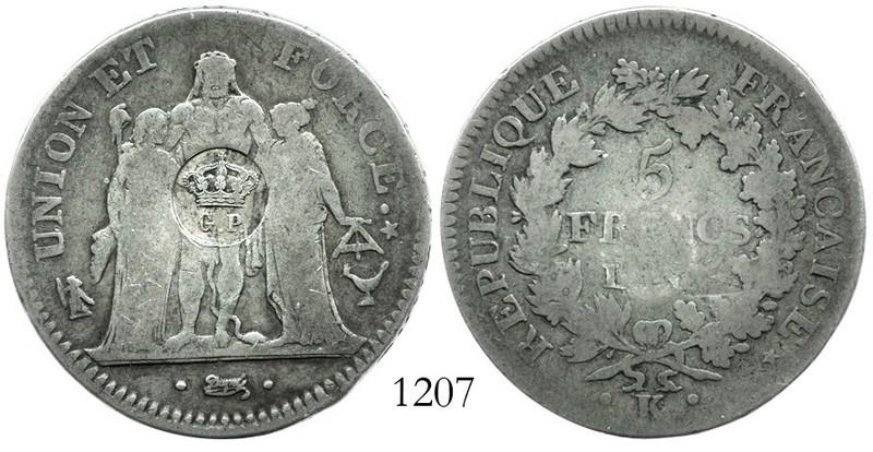 Azores, 1200 reis, "G.P." countermark (1887) on a French 5 francs L'AN 6, mintmark K, rare combinati
