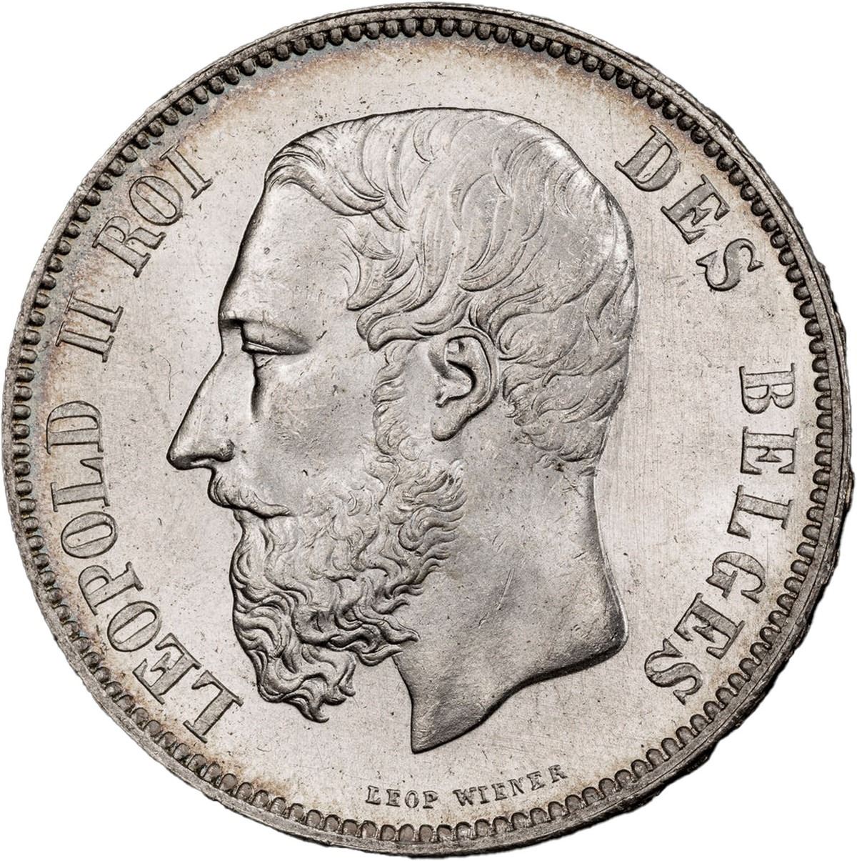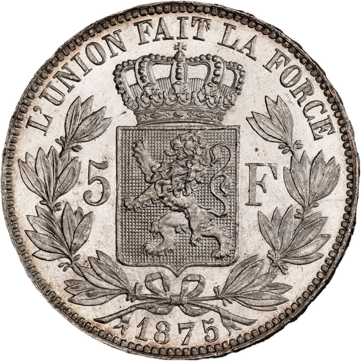 BELGIUM, 5 francs, Leopold II, 1875, PCGS MS 65+. KM-24. Nearly prooflike luster with light toning on rims only, one of only three at PCGS at this second-finest grade below a single MS66.