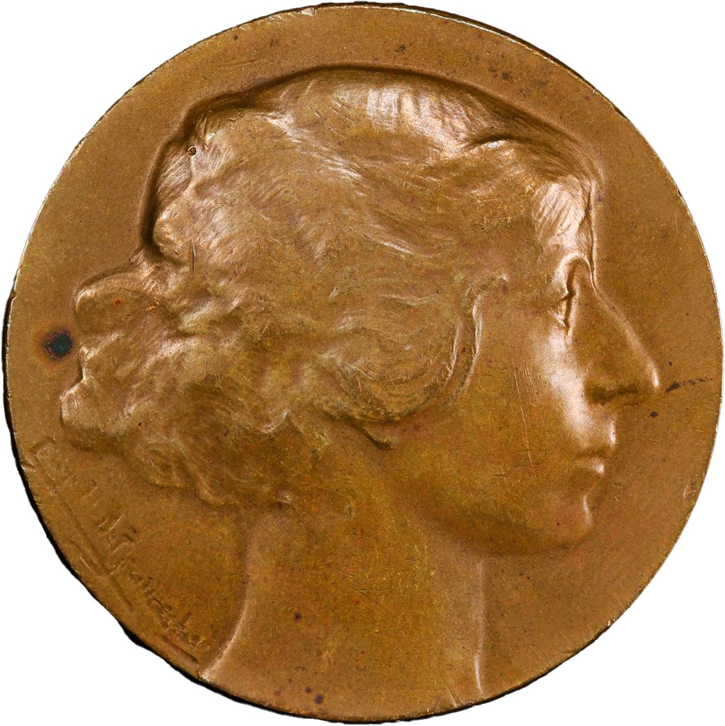 BELGIUM, bronze medal, no date (1912), Vanity (woman / skull), by Eugene de Bremaecker, PCGS MS62. 40 mm. Artistic piece in dull-brass color with woman's head on one side and human skull on the other, both signed by the Belgian sculptor/medalist Bremaecker (1879-1963), with VANITE / QU'ES TU..? (Vanity, who are you?) on the skull side, hence a symbolic essay on the deadly nature of vanity.