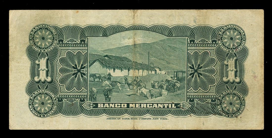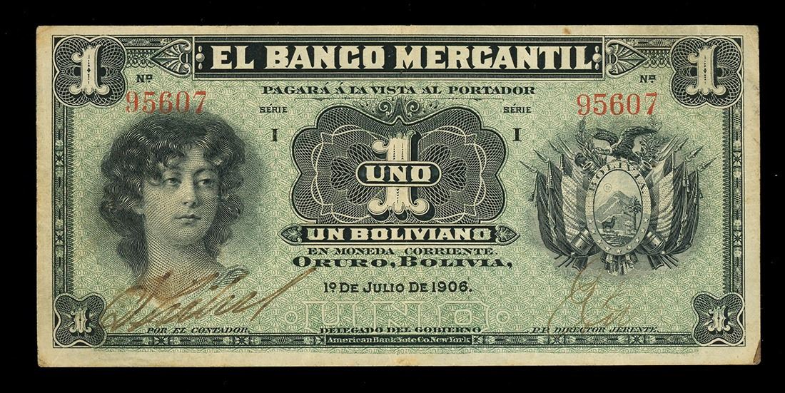 BOLIVIA, Oruro, Banco Mercantil, 1 boliviano, 1-7-1906, serial 95607. Pick-S171a. Very Fine example of this tougher private banco, bold inked design with clear signatures, some minor staining around the margins.