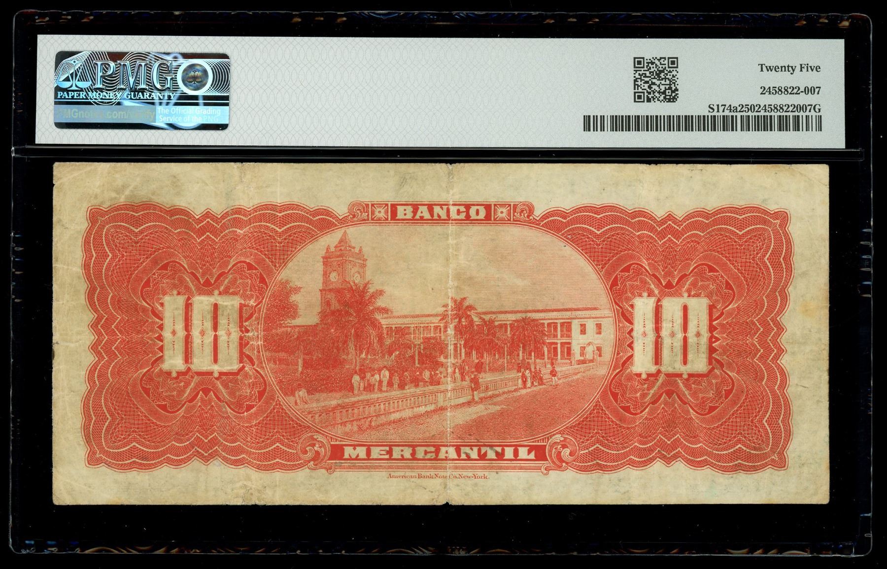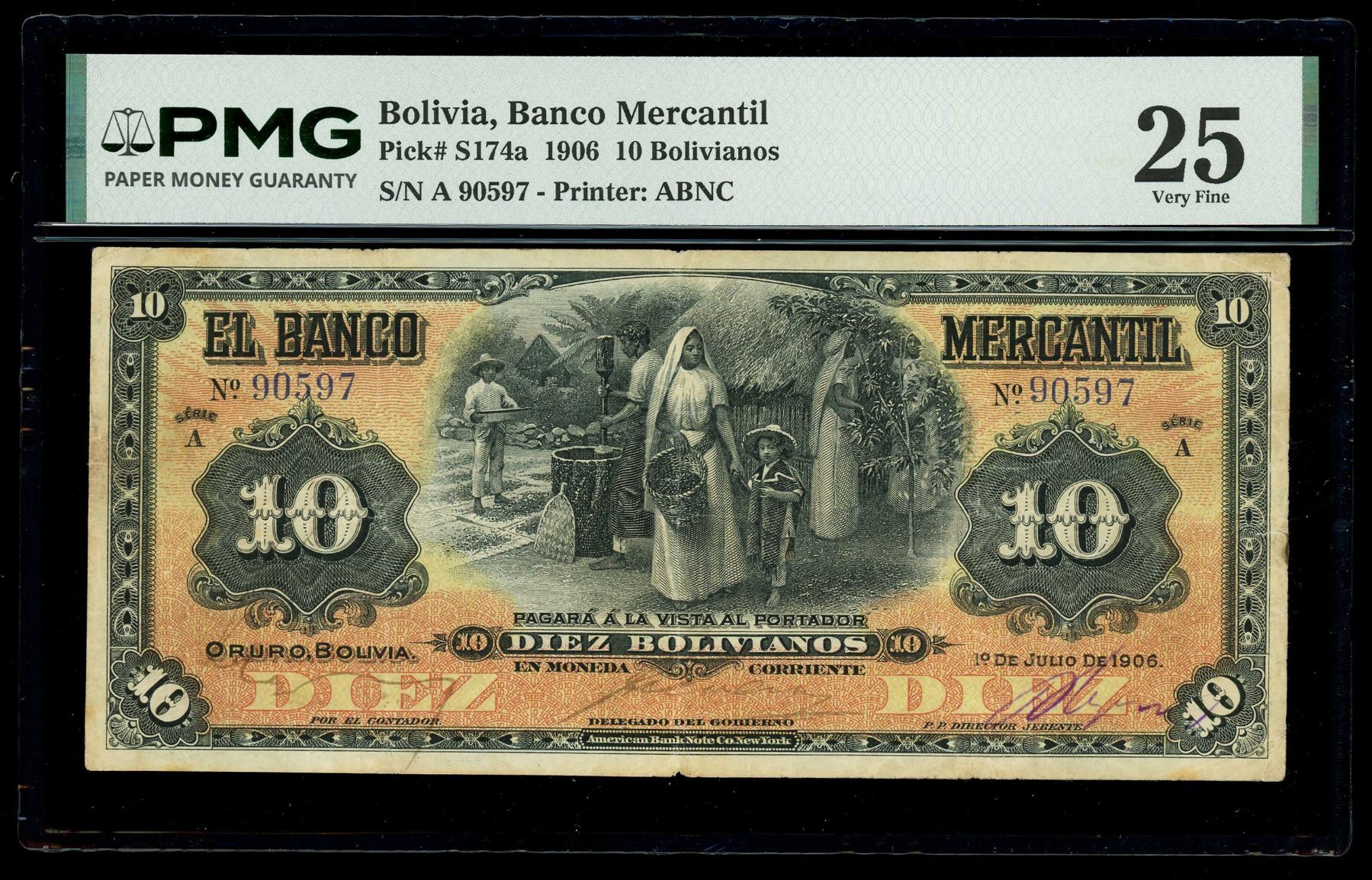 BOLIVIA, Oruro, Banco Mercantil, 10 bolivianos, 1-7-1906, series A, serial 90597, PMG VF 25, finest known in PMG census. Pick-S174a. Vivid red and yellow ink colors on this private bank note, which features a traditional Bolivian harvest scene as the central vignette on the face, well-centered design with nice margins showing some mild toning, one of just two listed in the PMG census and far surpassing the other known example in VG 8.