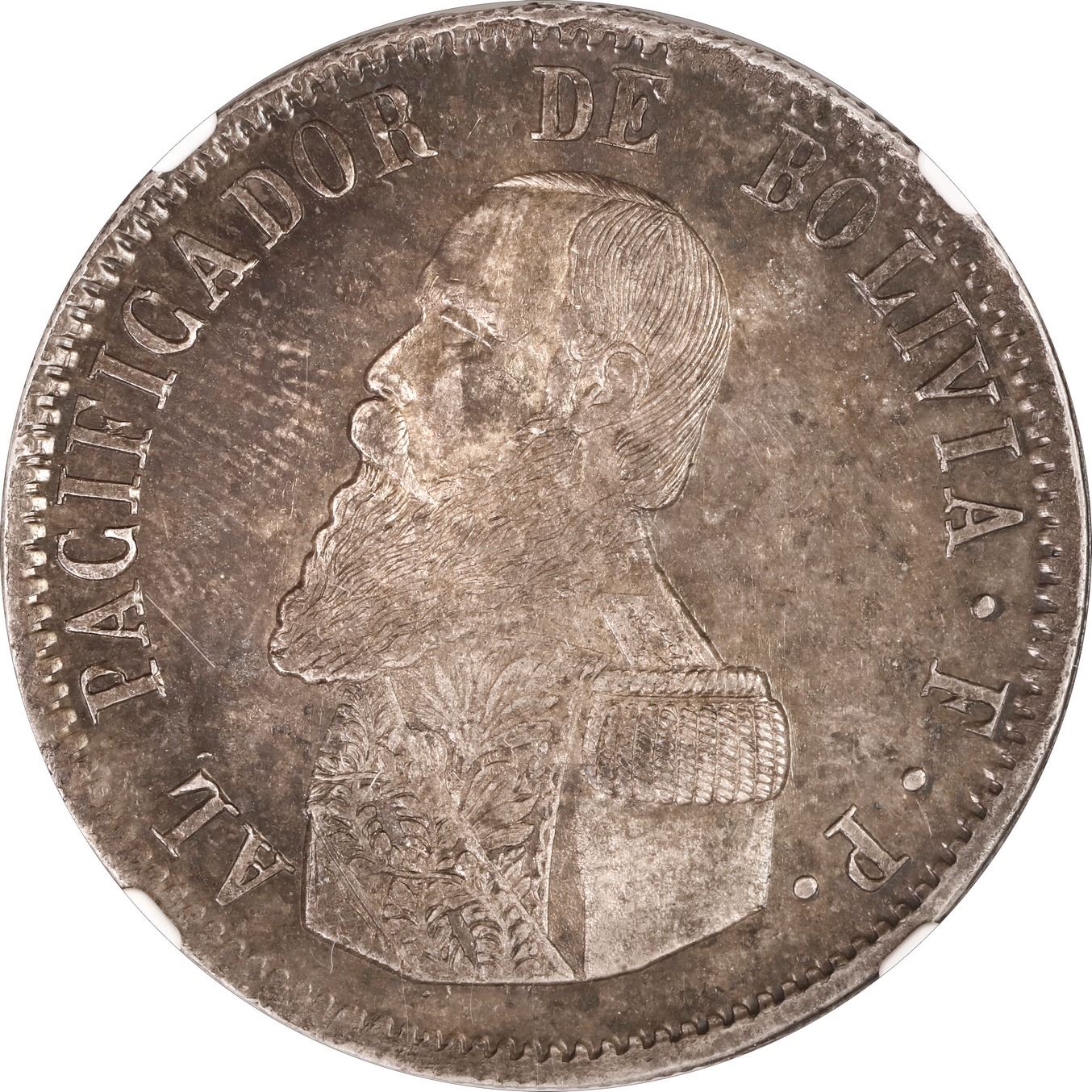 BOLIVIA, Potosí, 1 melgarejo monetary medal, 1865 FP, NGC AU 55. Fonrobert-9676; KM-146. Sharply detailed example with dark argent toning throughout.