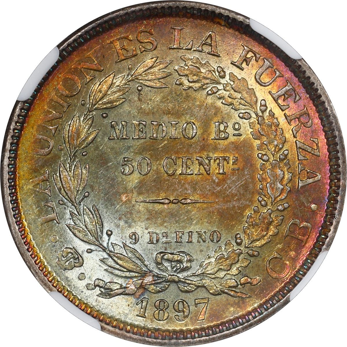 BOLIVIA, Potosí, 50 centavos, 1897 CB, NGC MS 63. KM-161.5. Beautiful piece with gorgeous vibrant rainbow toning across its lustrous surfaces on both sides.