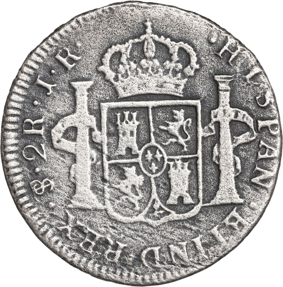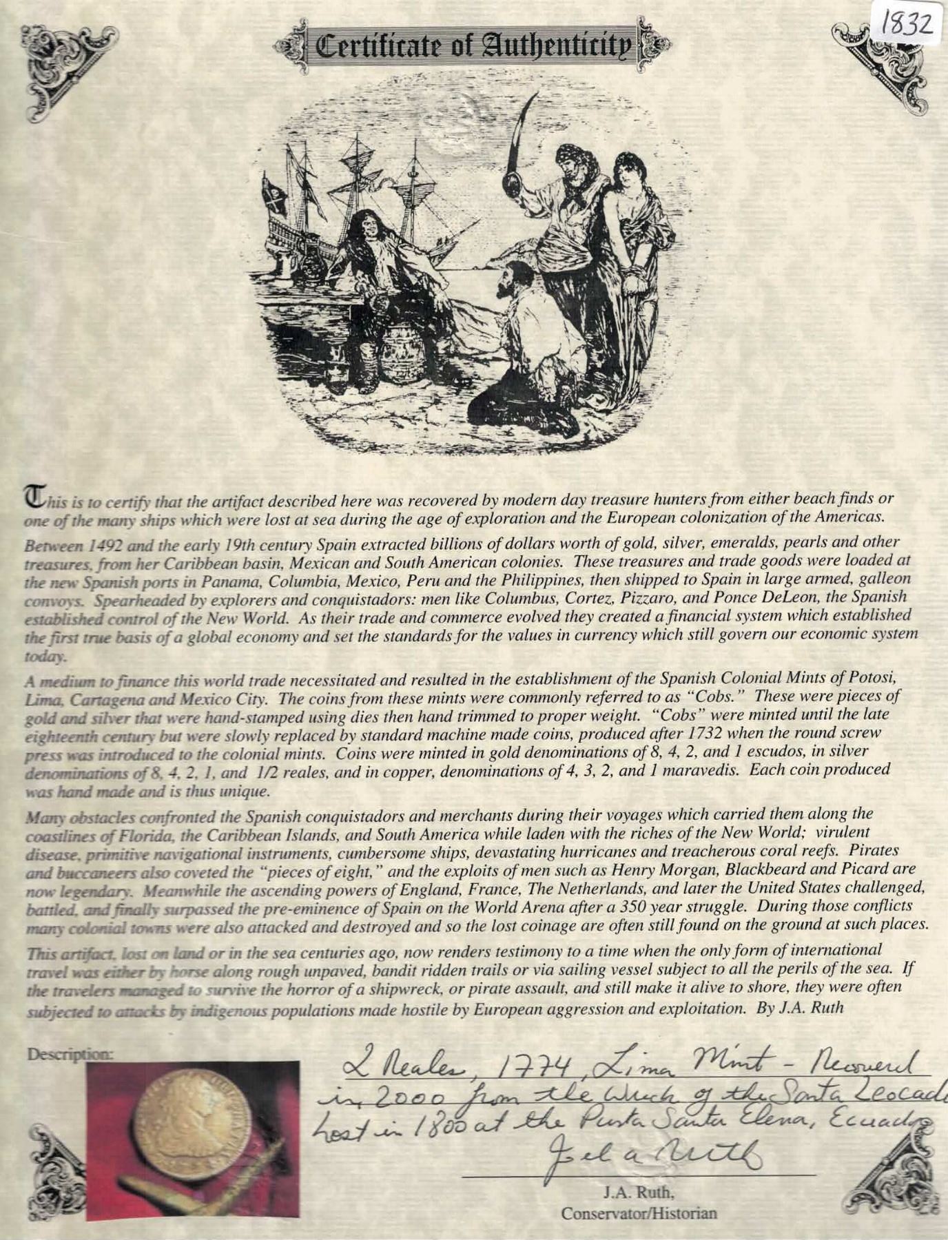 BOLIVIA, Potosí, bust 2 reales, Charles III, 1774 JR. Janson-65.2.3; KM-53; Cal-714. 5.22 grams. Solid XF piece with bold details despite minor surface corrosion, dark gray-toned fields, scarce denomination from this wreck. With original photo-certificate from the salvors (mis-attributed to Lima mint). Recovered from: Santa Leocadia, sunk in 1800 off Punta Santa Elena, Ecuador