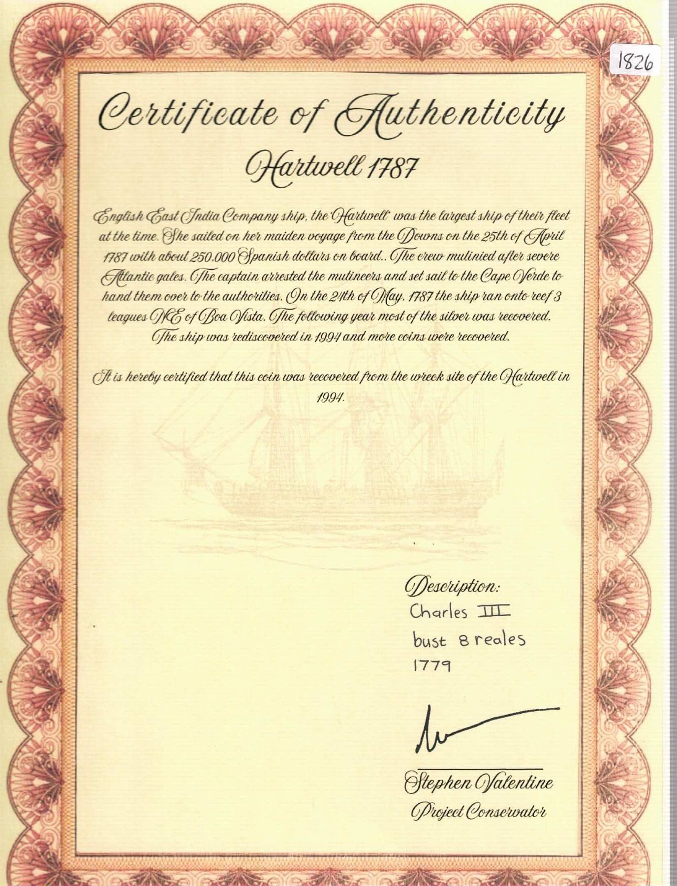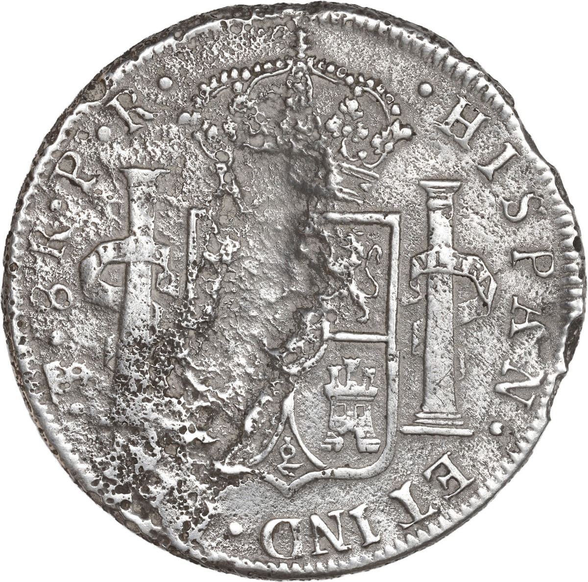 BOLIVIA, Potosí, bust 8 reales, Charles III, 1779 PR. Janson-63.8.3; Cal-1176; KM-55. 22.82 grams. Nice AU details on the bust side but with a corroded pit along the back, nicer than usually encountered from this wreck. Pedigreed to the Steve Valentine Collection, with original certificate from the salvor/conservator. Recovered from: Hartwell, sunk in 1787 off South Africa