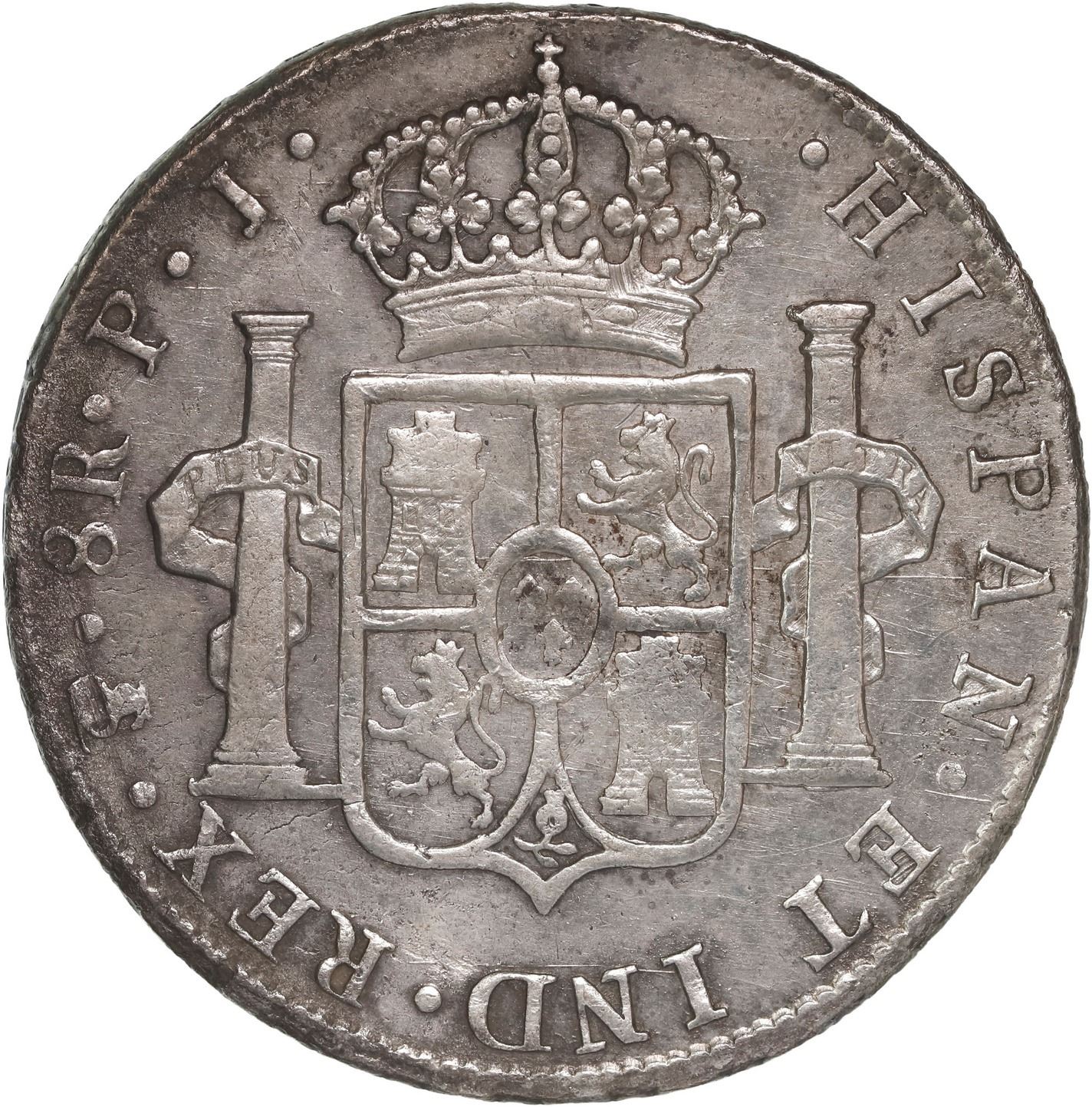BOLIVIA, Potosí, bust 8 reales, Charles IV, 1807 PJ. Janson-76.19; Cal-1013; KM-73. 26.52 grams. Sharp AU details with practically no corrosion, traces of toning at edge, a very choice coin for this wreck. With "Atlantic Sands" tag 283. Recovered from: "Coconut Wreck," sunk ca. 1810 in deep water off Bermuda