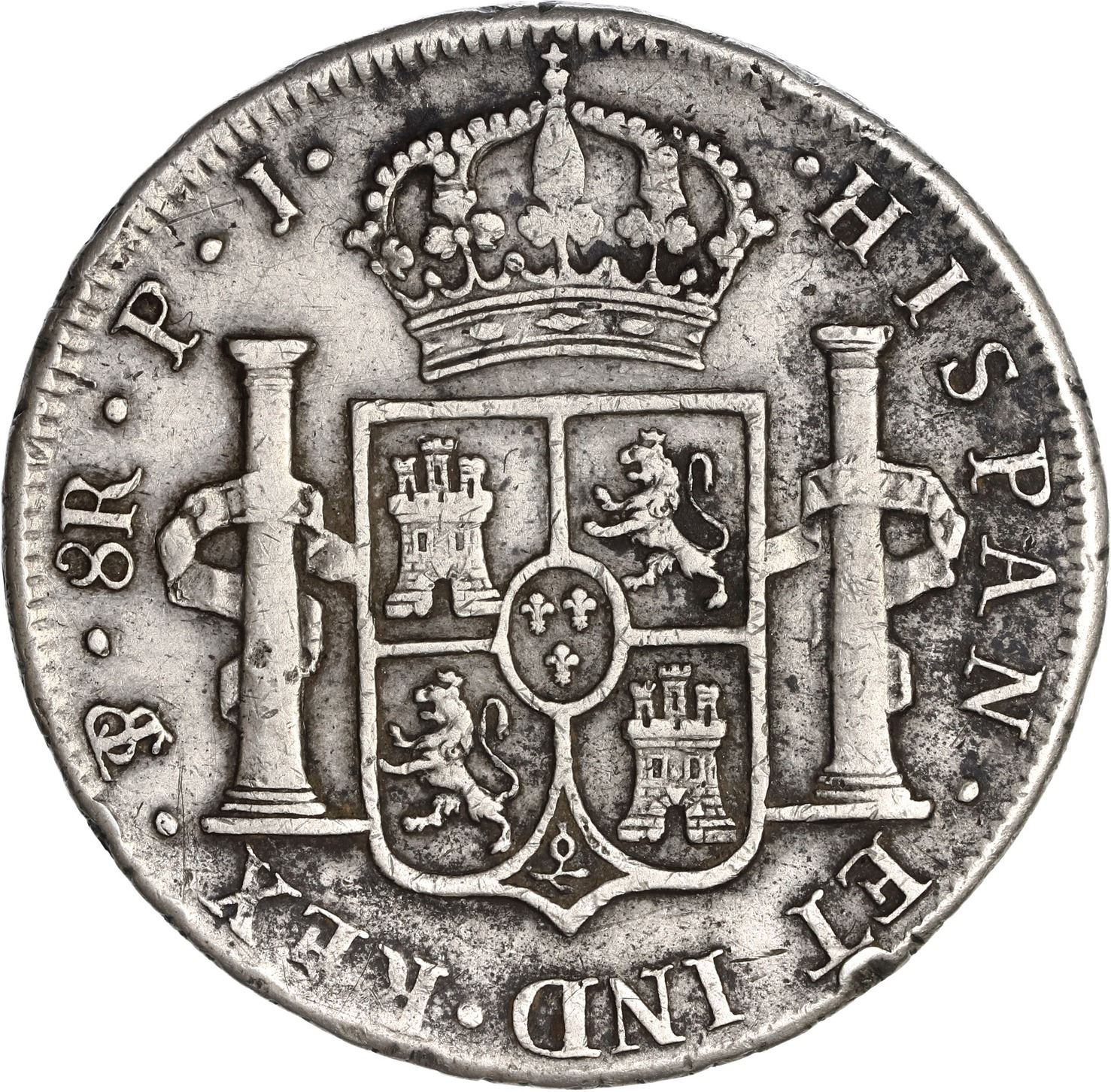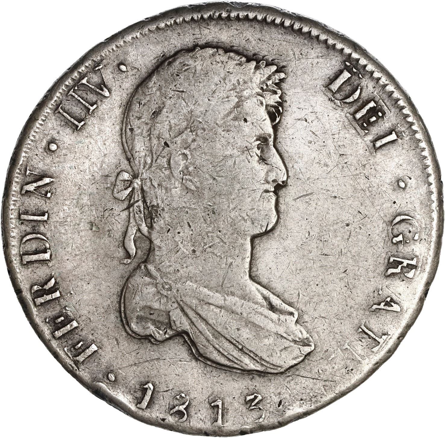 BOLIVIA, Potosí, bust 8 reales, Ferdinand VII, 1813 PJ, error with king's ordinal as IIV, rare. Cal-1376; KM-84. 26.55 grams. Rare error with king's ordinal erroneously stamped backwards into the die; this is the only date for the type known to feature this error. VF with minor strike doubling on the obverse, a few surface marks and knocks in edge.