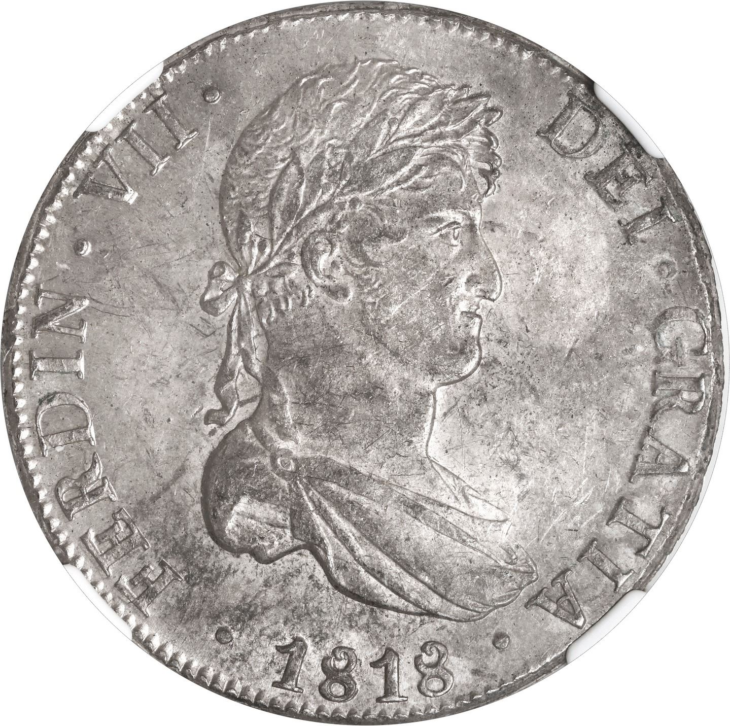 BOLIVIA, Potosí, bust 8 reales, Ferdinand VII, 1818 PJ, NGC MS 61+. Janson-86.8; Cal-1382; KM-84. Bold strike with much luster (particularly on the reverse, the obverse being lightly toned), within the top 9% of examples graded by NGC, parts of rims weak (as made).