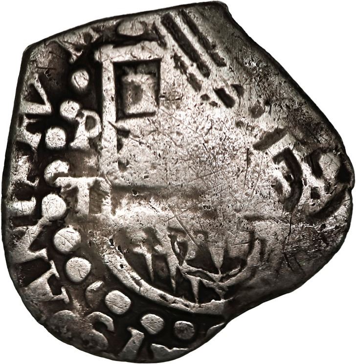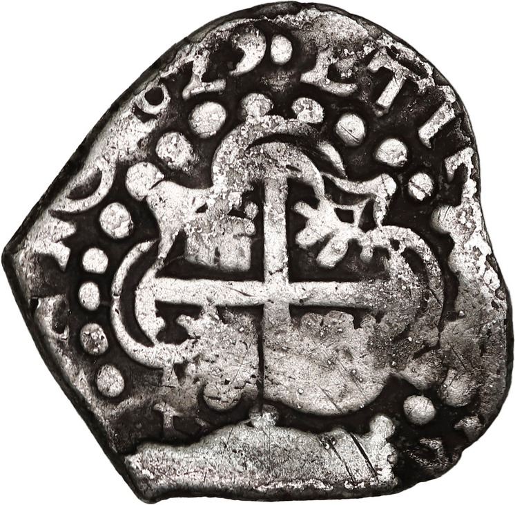 BOLIVIA, Potosí, cob 1 real, 1629 T, very rare, ex-Ponte. S-P26; KM-12a; Cal-717. 2.83 grams. Clear bottom half of date outside of full cross, weak and doubled shield with bold P-T to left, non-round flan with part of edge folded over (as made), VG with contrasting toning. Pedigreed to the Luis R. Ponte Collection.