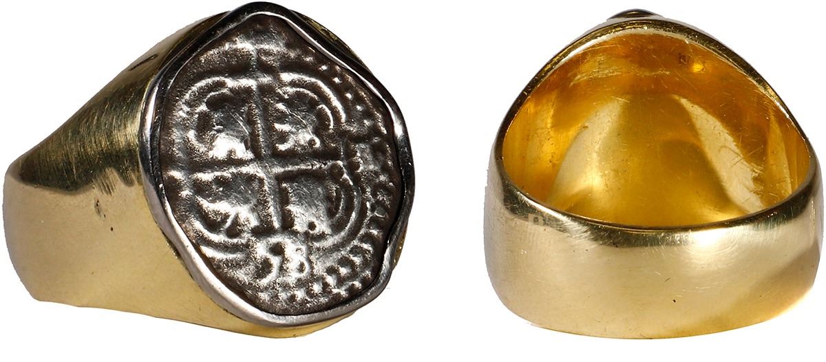 BOLIVIA, Potosí, cob 1 real, 1658 E, ex-Joanna (1682), mounted cross-side out in men's 18K gold ring. 28.67 grams total. Nice full cross with clear date below and assayer at right, wrapped in silver band and set into the top of a size 11 gold ring. From the Joanna (1682), pedigreed to the Steve Valentine Collection, with original certificate from the salvor/conservator.
