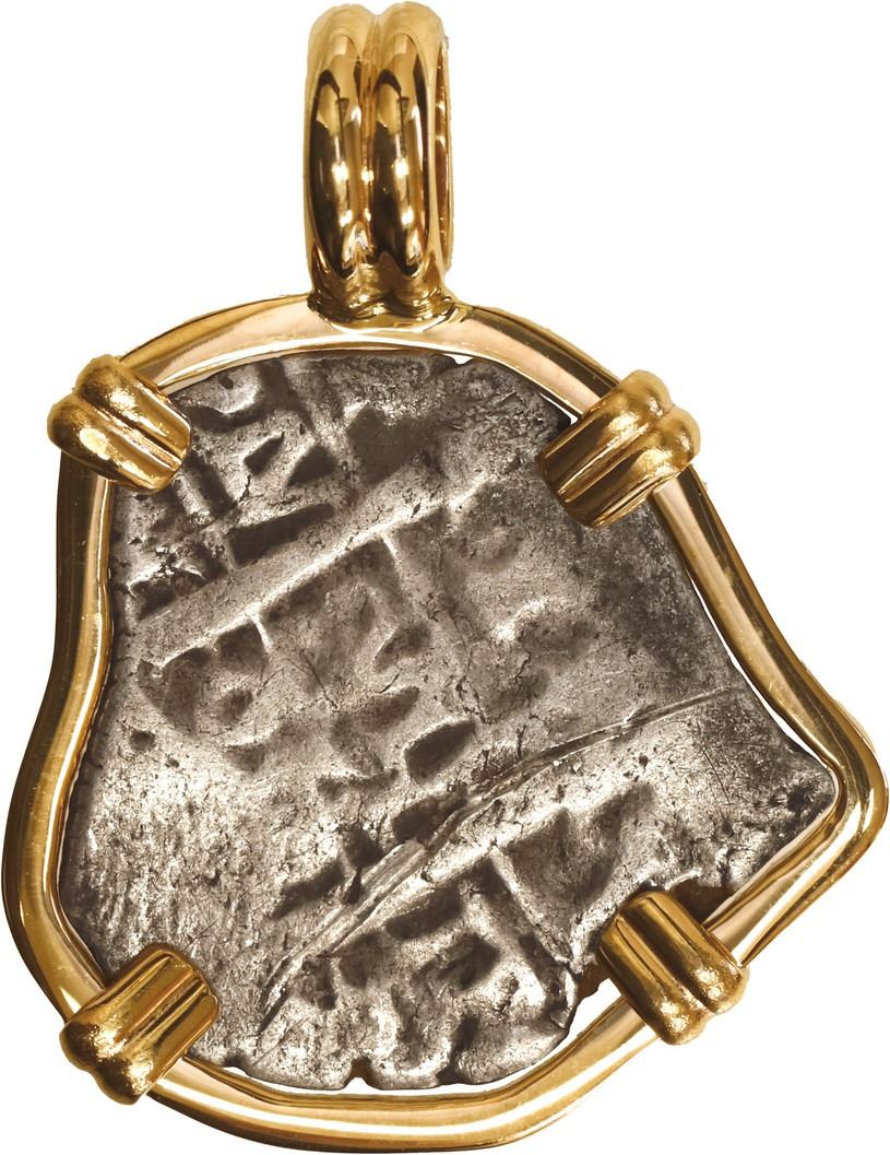 BOLIVIA, Potosí, cob 1 real, 1708 Y, mounted cross-side out in 14K gold bezel with fixed bail. 5.72 grams total. Bold and nearly complete (if a little off-center) cross with nice clear date below, weak pillars side with old scratch but also possessing visible date and assayer, securely mounted in custom pendant setting.