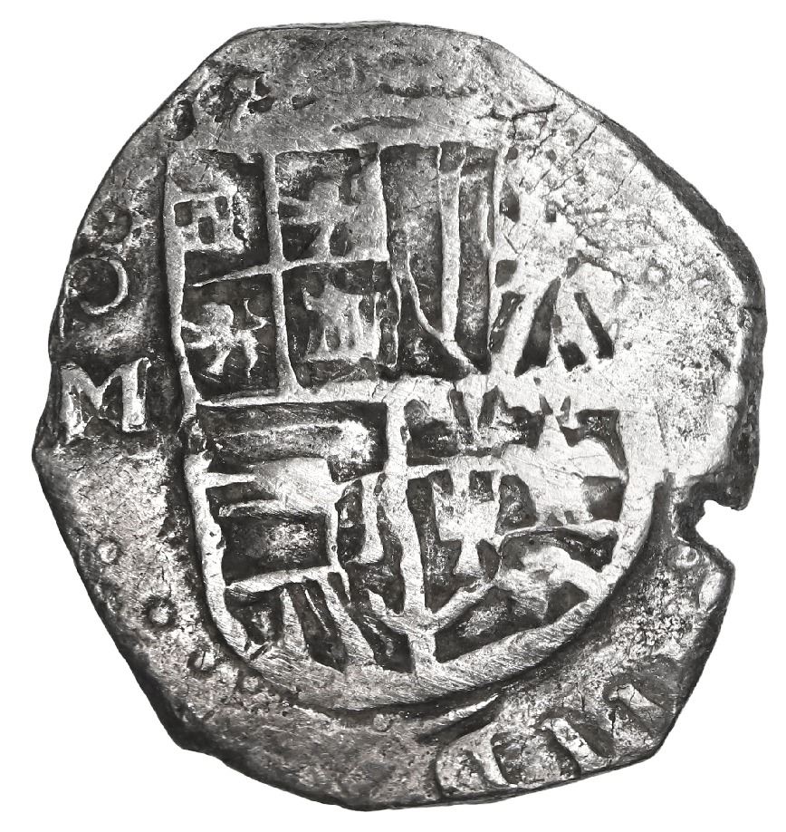 BOLIVIA, Potosí, cob 2 reales, (1617) M, Grade 1. S-P19; KM-8; Cal-629. 6.76 grams. Choice full shield with bold P-M to left and most of king's ordinal III in legend, good full cross, nicely toned and corrosion-free, tiny natural notch in edge. With original Fisher tag and certificate 86A-131711. Recovered from: Atocha, sunk in 1622 west of Key West, Florida