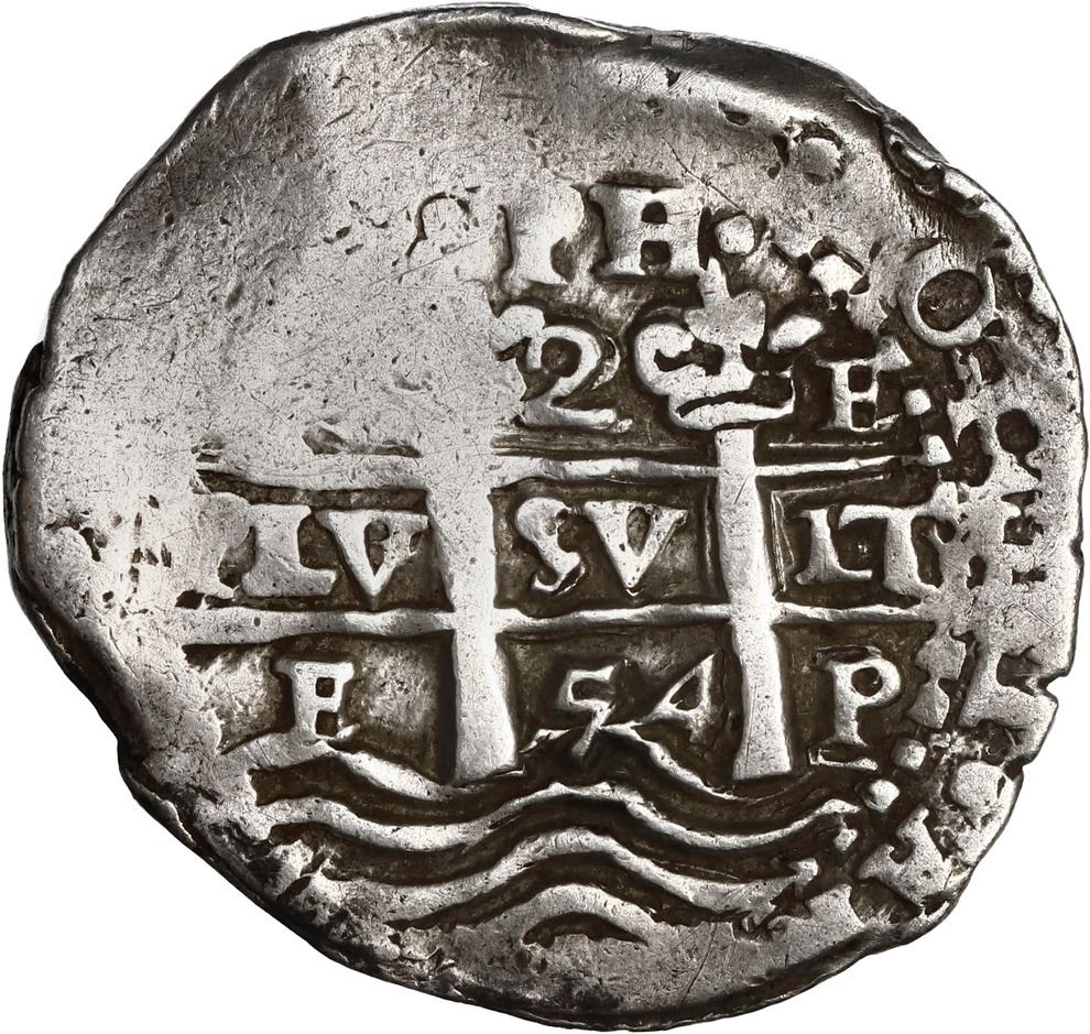 BOLIVIA, Potosí, cob 2 reales, 1654 E, •PH• at top, denomination above cross. 6.05 grams. Broad flan with choice full pillars-and-waves and cross-lions-castles, two dates and mintmarks, all three assayers, AXF with toning on fields, flat area in periphery.