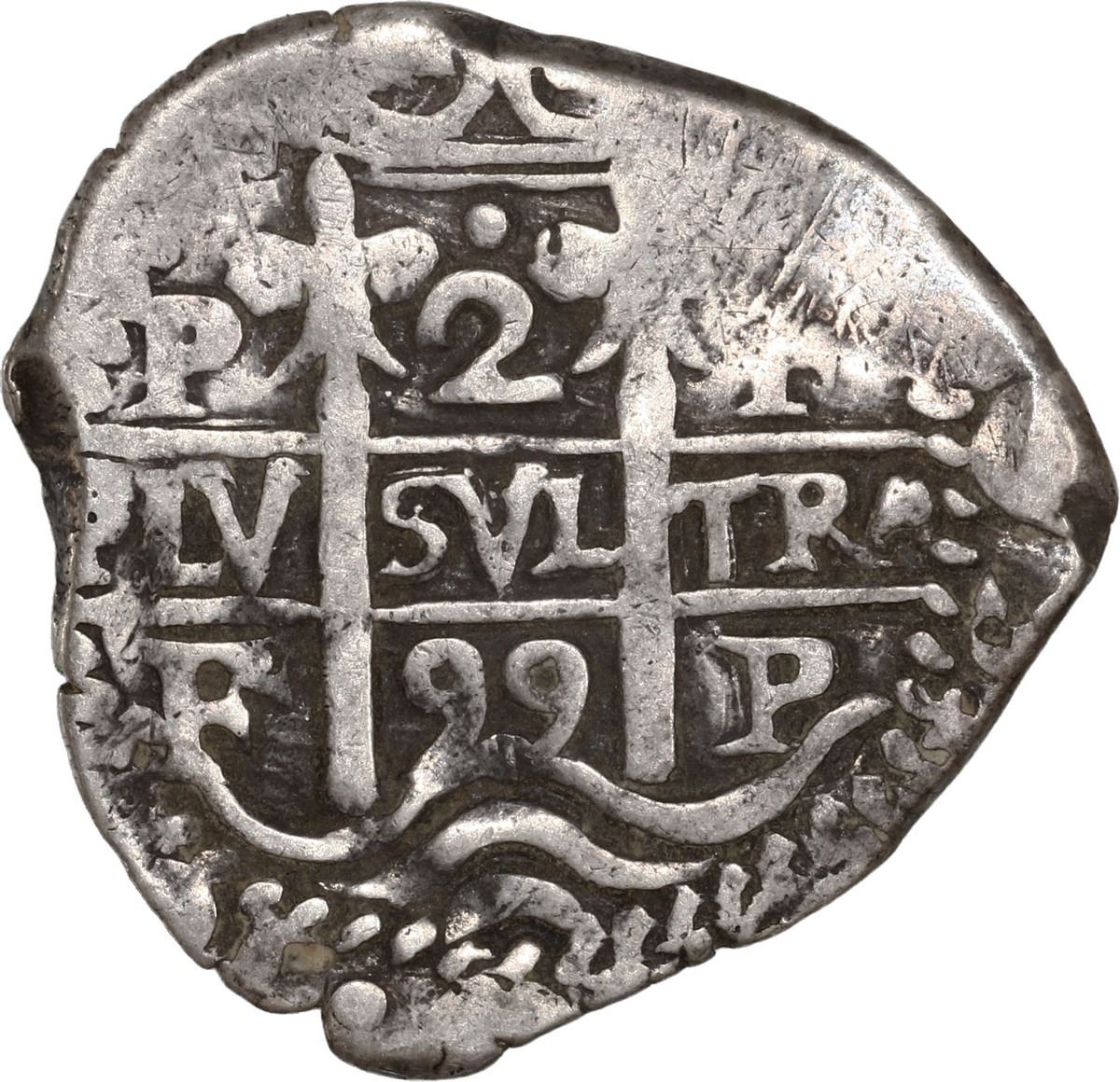 BOLIVIA, Potosí, cob 2 reales, 1699 F. S-P42; KM-24; Cal-434. 6.27 grams. Choice full cross-lions-castles and pillars-and-waves (exceptional for this assayer), two dates, three mintmarks and assayers, VF with darkly toned fields.