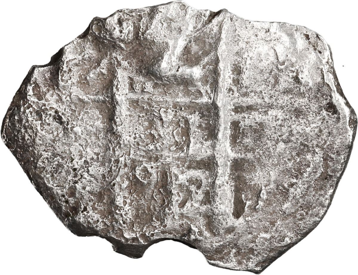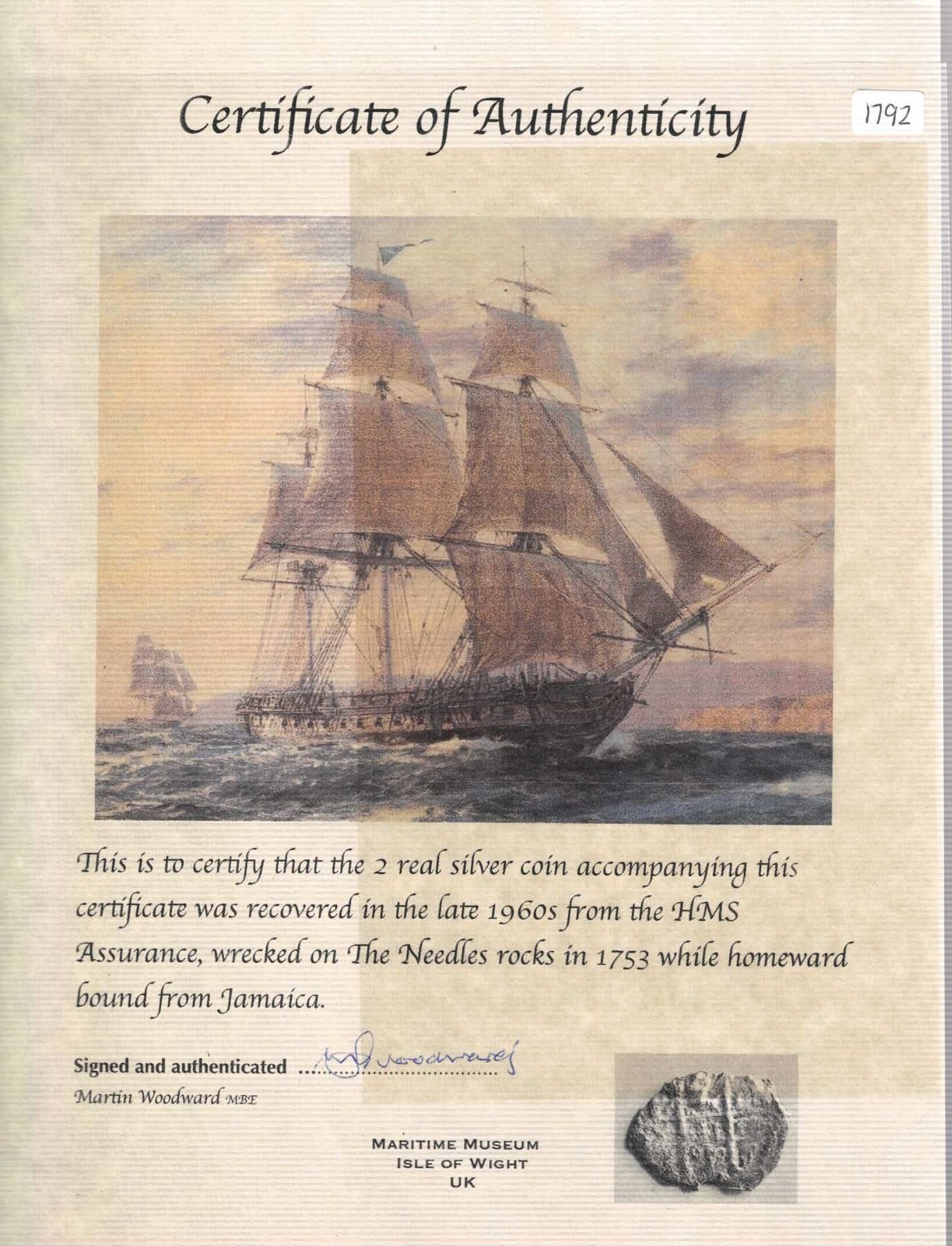 BOLIVIA, Potosí, cob 2 reales, 1732 M. S-P44; KM-29a; Cal-907. 3.60 grams. Corroded with weak pillars and cross detail though with just enough of the date visible, rare wreck provenance. With original photo-certificate from the salvor. Recovered from: HMS Assurance, sunk in 1753 off Isle of Wight, south of England