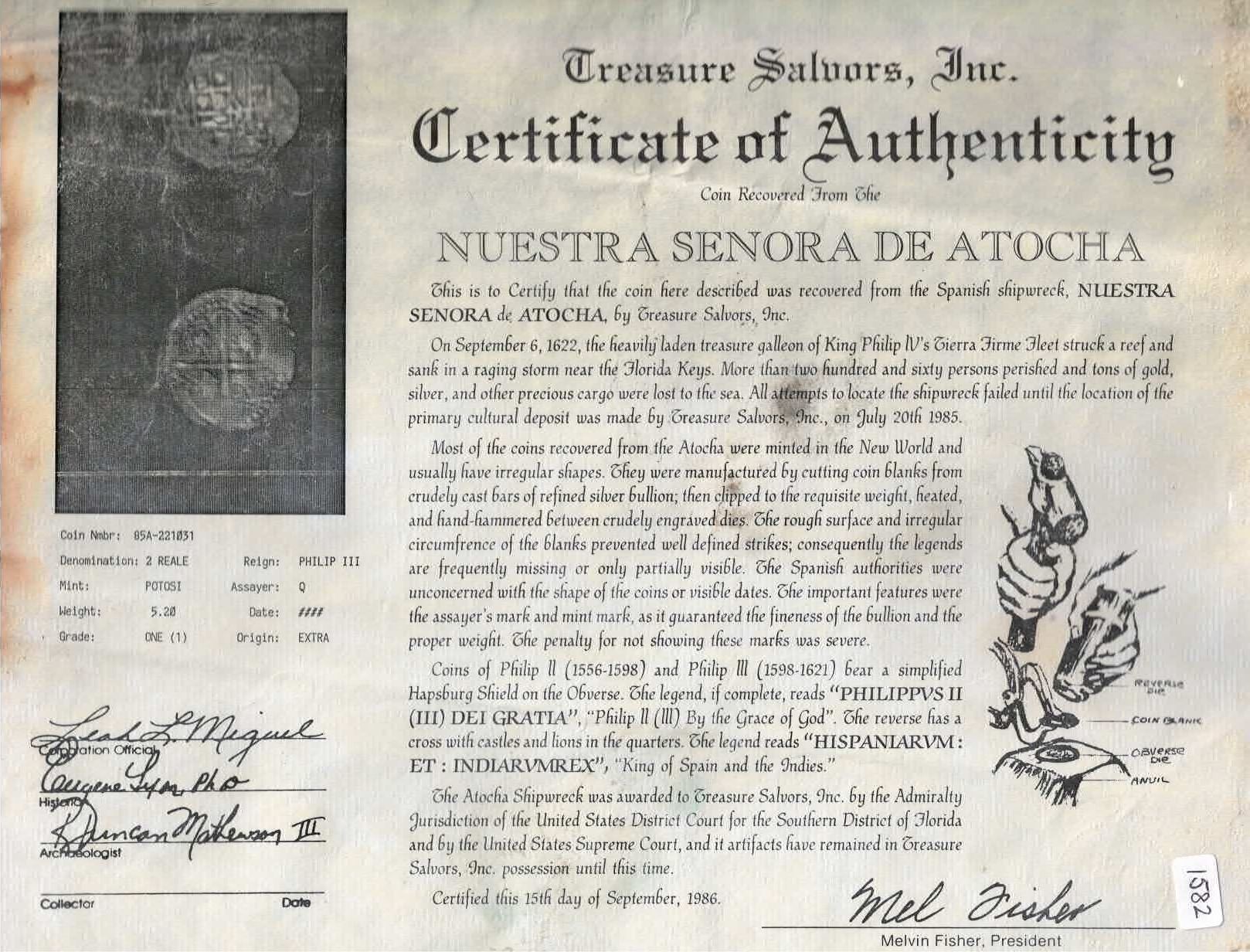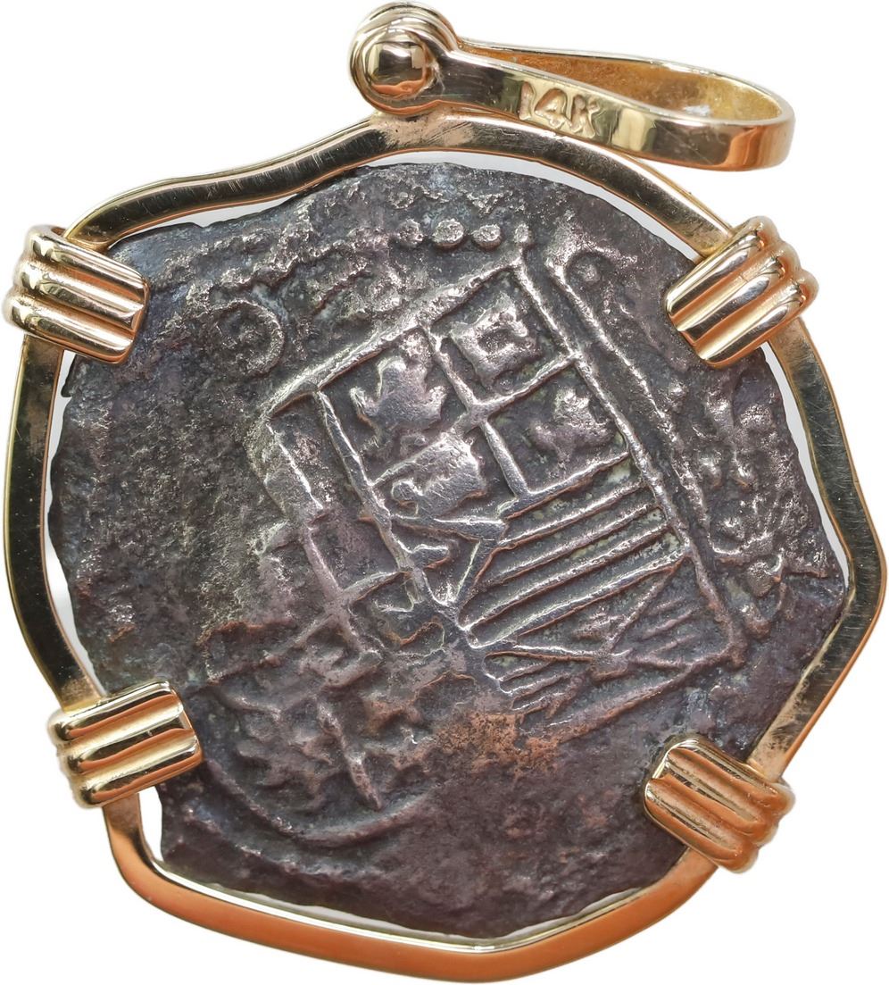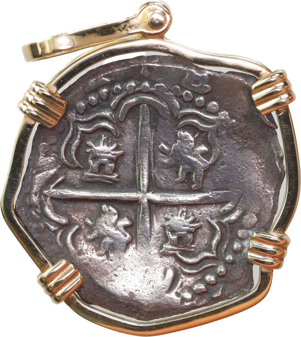 BOLIVIA, Potosí, cob 2 reales, Philip III, assayer Q, Grade 1, ex-Atocha (1622), mounted cross-side out in 14K gold pendant with shackle bail. 8.48 grams total. Particularly choice cross side with full cross and bold castles-and-lions without any corrosion about its semi-lustrous surfaces, dark gray-toned complete shield with minor surface corrosion yet still showing a clear mintmark and assayer. From the Atocha (1622), with Fisher tag and certificate 85A-221031 (barcode missing).