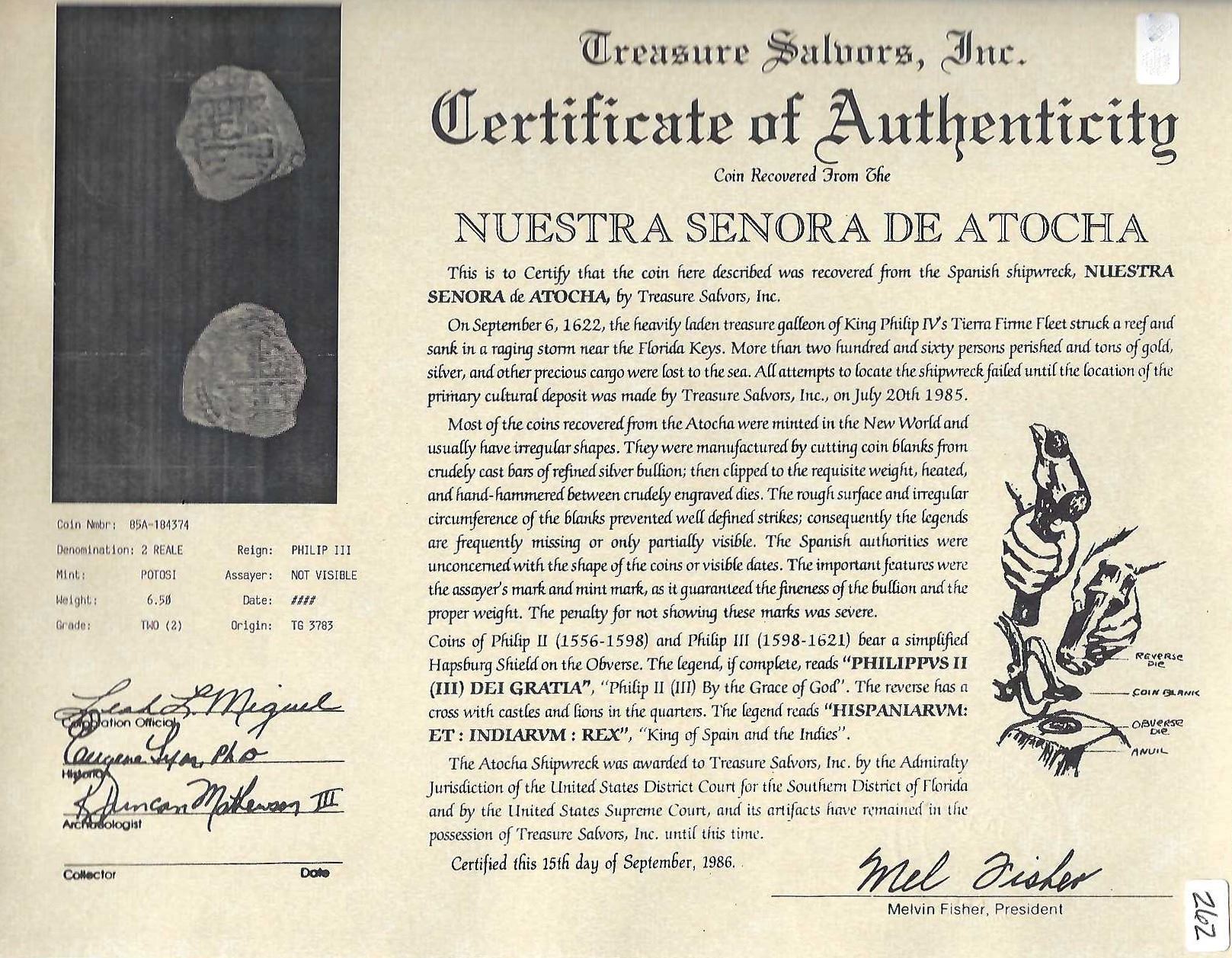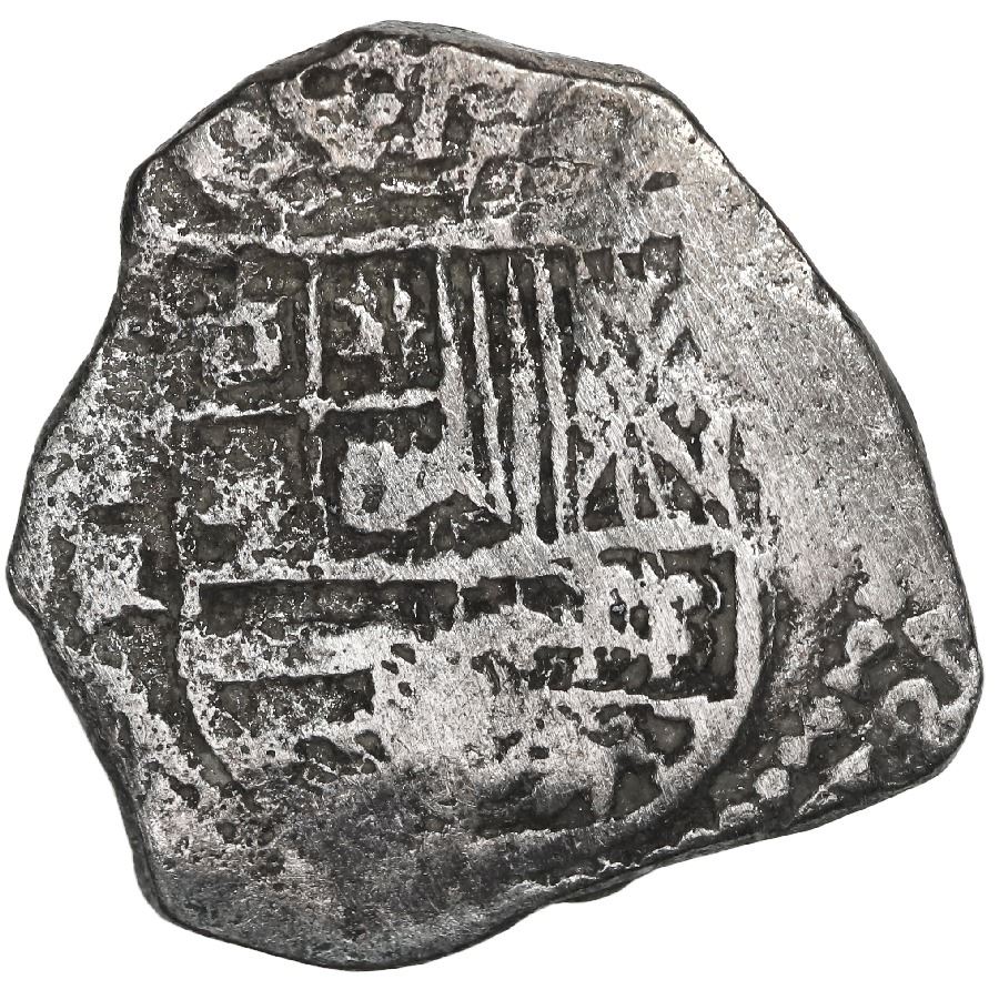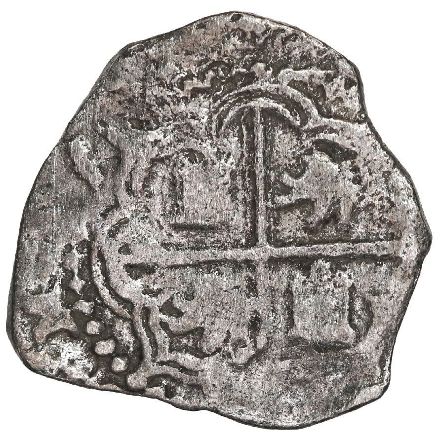 BOLIVIA, Potosí, cob 2 reales, Philip III, assayer RL (straight leg), Grade 2. S-P15; KM-8; Cal-626. 6.59 grams. Odd-shaped flan (as made) with clear assayer (assayer not mentioned on tag or certificate) to left of good full shield, backwards S at end of king's name before ordinal III in legend, decent cross despite very light surface corrosion, unevenly toned. With original Fisher tag and certificate 85A-184374. Recovered from: Atocha, sunk in 1622 west of Key West, Florida