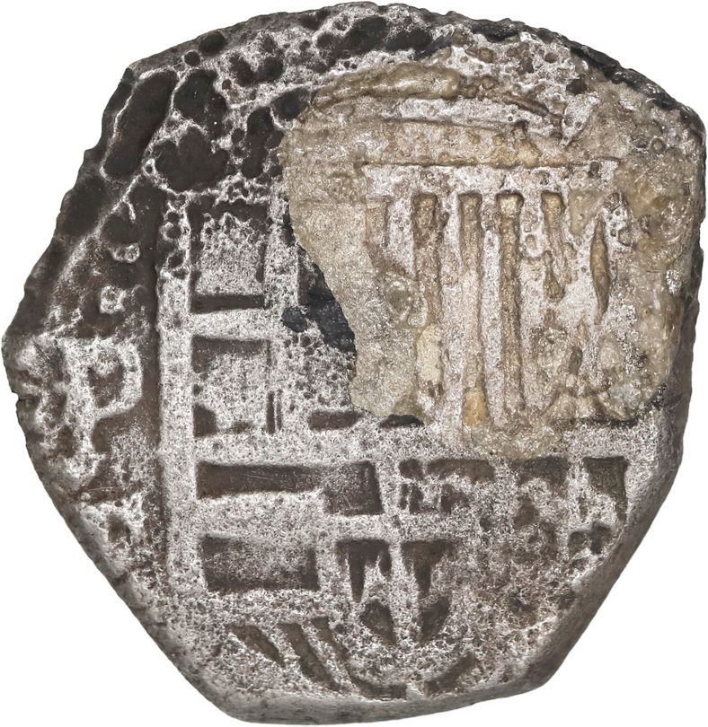BOLIVIA, Potosí, cob 2 reales, Philip IV, assayer T. KM-14a; Cal-Type 239. 5.72 grams. Solid piece with some pitting around the edges but with bold shield and mintmark, assayer struck off flan, weak yet full cross. Pedigreed to Sedwick Auction 9, with original lot-tag 681. Recovered from: “Jupiter Wreck” (San Miguel Arcángel), sunk in 1659 off the east coast of Florida