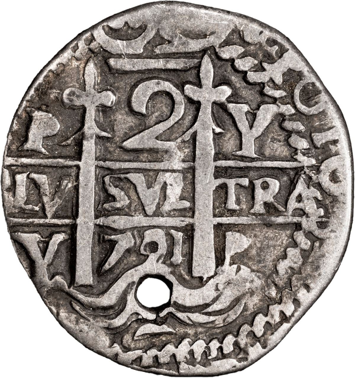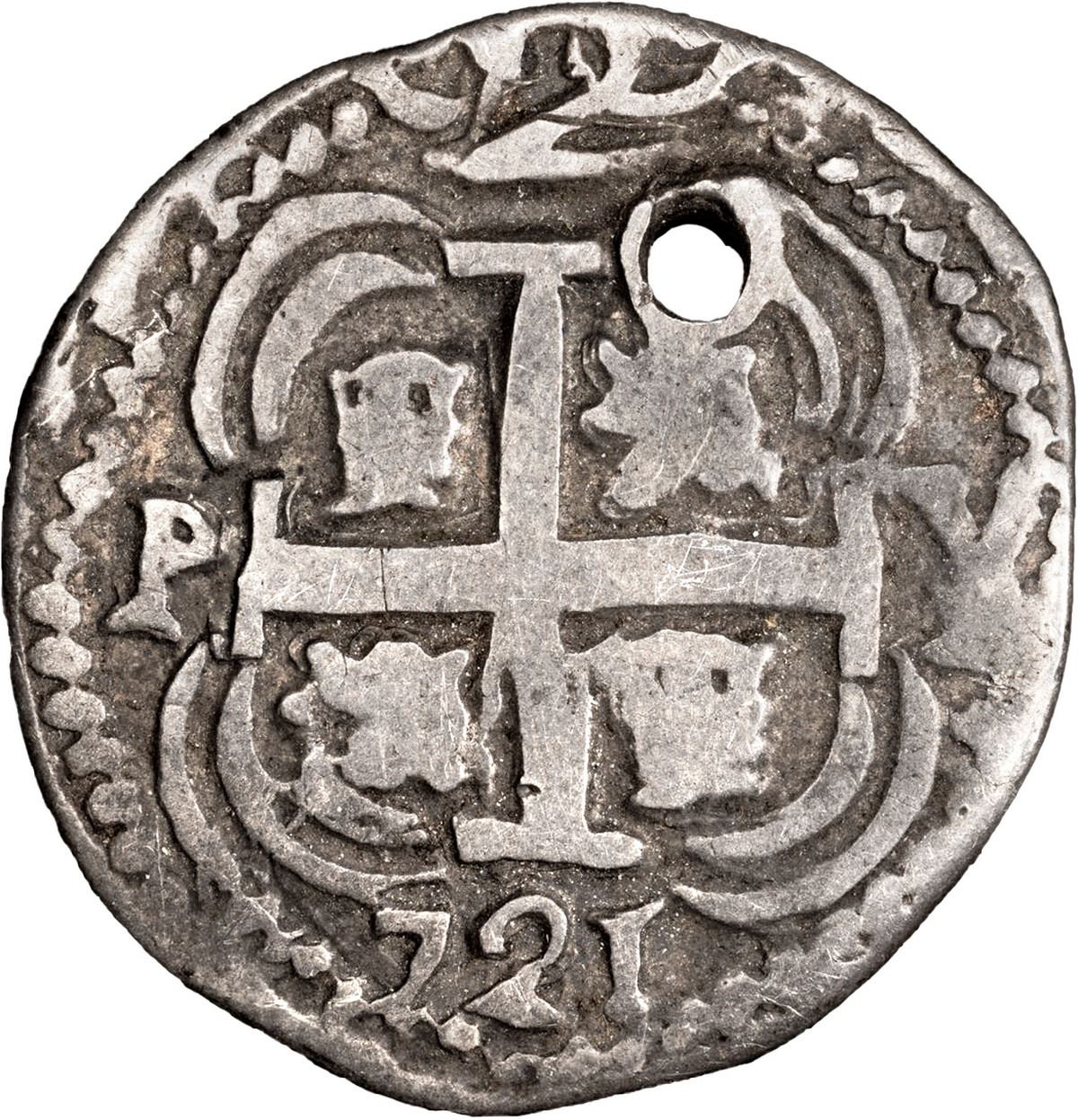 BOLIVIA, Potosí, cob 2 reales Royal (galano), 1721 Y, very rare, PCGS VF details / holed, finest and only example in PCGS census. S-P43a; KM-R29; Cal-846. 6.73 grams. Perfectly round and evenly struck with 100% full inner details (pillars side slightly off-center), richly toned all over, with hole at bottom of pillars / near top of cross, only the second example we have seen (the other being the KM Plate Coin), with none in the NGC census.