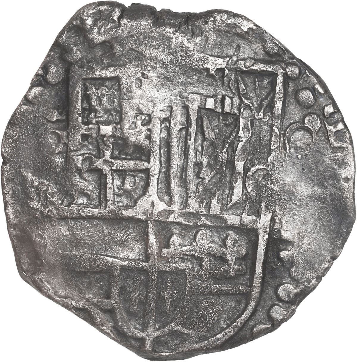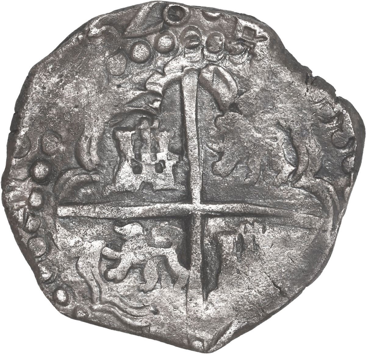 BOLIVIA, Potosí, cob 4 reales, 1628 (T or P), "hunched over" lions, rare, ex-Christensen. KM-17a; Cal-Type 279. 13.33 grams. Clear 6Z of date followed by bottom half of 8 outside of nearly full cross, good full shield despite minor doubling and surface corrosion, dark all over, desirable original pedigree. Pedigreed to the original Christensen "Conception" auction of May 1982, lot 147, with salvors' tag 10032 and NGC label XF details / environmental damage. Recovered from: Concepción, sunk in 1641 off Hispaniola
