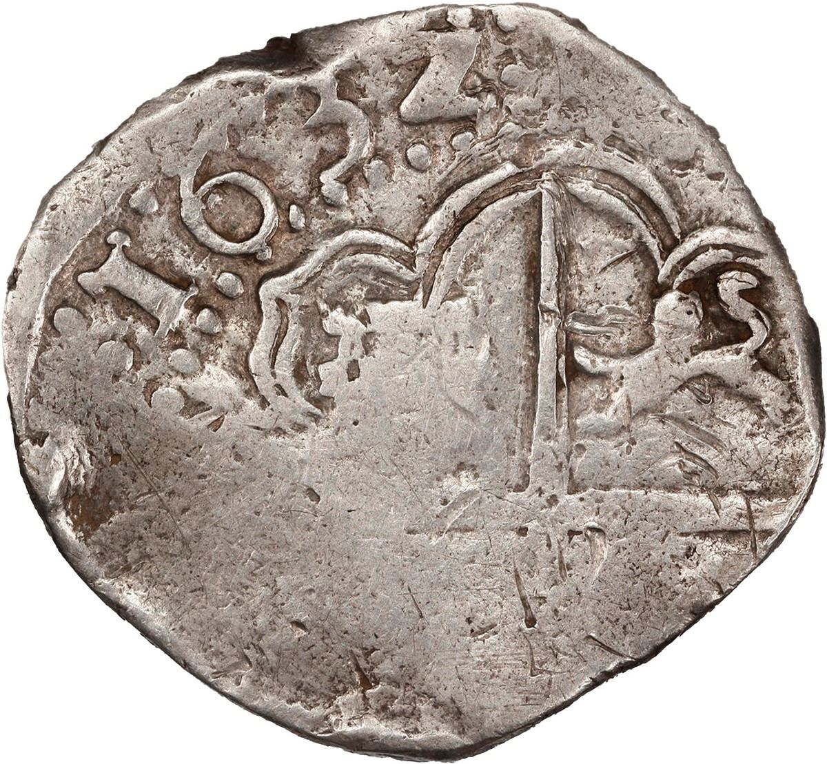 BOLIVIA, Potosí, cob 4 reales, 1632 T, rare, PCGS VF details / planchet flaw, finest and only example in PCGS census, ex-Americas, ex-Pat Johnson (stated on label). S-P26; KM-17a; Cal-1096. 12.68 grams. Very choice full four-digit date outside of half-flat cross, bold but rather off-center shield exhibiting a large natural lacuna at top, traces of toning and orange sediment in crevices. Pedigreed to the Americas Collection (Kagin's auction of August 1983, with original lot-tag 1137) and to the Pat Johnson Collection (Stack's Bowers auction of November 2022, lot 71084).