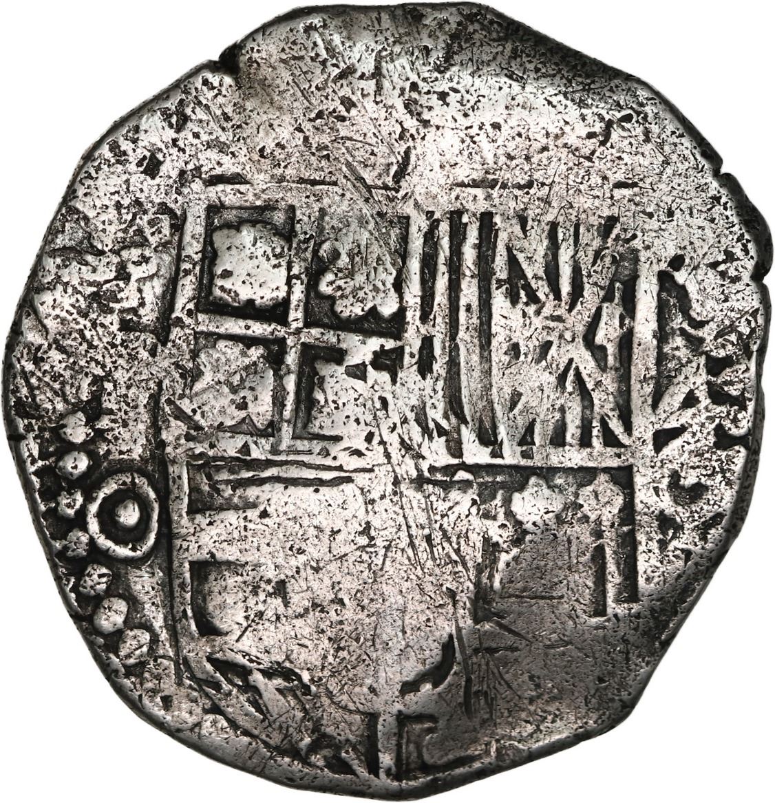 BOLIVIA, Potosí, cob 4 reales, (1650) O, with pentagonal crowned-1652 countermark (unique) on cross, ex-Ponte, Mastalir Plate. S-P35; KM-17b; Cal-1106. 13.31 grams. Bold and nearly full countermark (in fact, the ONLY example of this countermark known on a 4R!) at bottom left of full cross, full shield with bold O to left and clear 4-O to right, weakly struck with flat areas but no visible corrosion, toned in crevices, nice round flan. Pedigreed to the Luis R. Ponte Collection and Sedwick Auction 17 (lot 388), also plated on page 388 of Mastalir's book The Great Transition at the Potosí Mint, 1649-1652: The 1649-1652 Crowned Shield Coinage and the Countermarks of 1652, Part B: The Countermarks of 1652 (2020). Recovered from: Capitana, sunk in 1654 off Chanduy, Ecuador