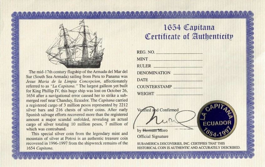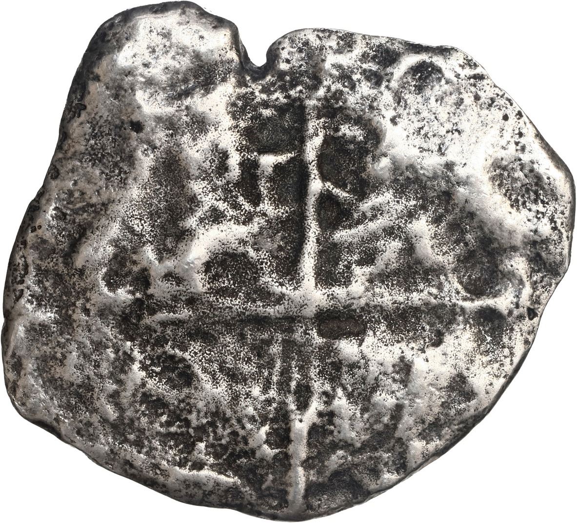 BOLIVIA, Potosí, cob 4 reales, (1651-52) E, with crowned-•F• (two dots) countermark on shield. S-P36; KM-17b; Cal-Type 279. 8.64 grams. Choice full shield with bold countermark and clear assayer E to right, the cross side heavily corroded, overall thin and truncated from loss around edge, nicely toned. With original Herman Moro tag and certificate. Recovered from: Capitana, sunk in 1654 off Chanduy, Ecuador