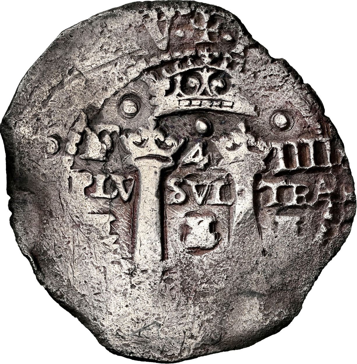 BOLIVIA, Potosí, cob 4 reales, 1652 E, transitional McLean Type I, lower denomination 4 over E, NGC VF details / saltwater damage (Shipwreck Blue Label), ex-Zbar. S-P37; KM-A18; Cal-1109. 12.49 grams. Broad flan with some peripheral flatness but practically no corrosion, good full pillars and shield, nicely toned, Mastalir I.1-A.ca for subtype (the 4/E at bottom rather clear). Pedigreed to the Jack Zbar Collection (stated on label). Recovered from: Maravillas, sunk in 1656 off Grand Bahama Island