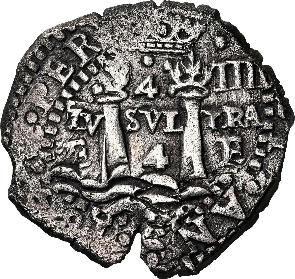 BOLIVIA, Potosí, cob 4 reales, 1652 E, transitional McLean Type II, NGC AU details / saltwater damage (Shipwreck Blue Label), ex-Zbar. S-P37; KM-B18; Cal-1111. 12.56 grams. Choice and bold bust slightly doubled pillars-and-waves, full but corroded cross-lions-castles, nicely toned, edge-split, Mastalir I-B.ca for subtype. Pedigreed to the Jack Zbar Collection (stated on label). Recovered from: Maravillas, sunk in 1656 off Grand Bahama Island