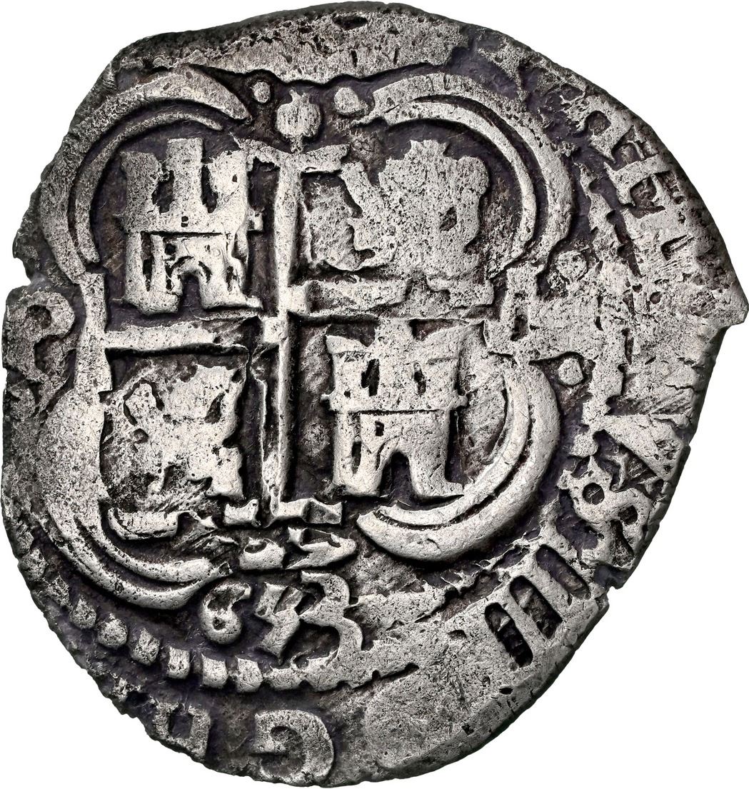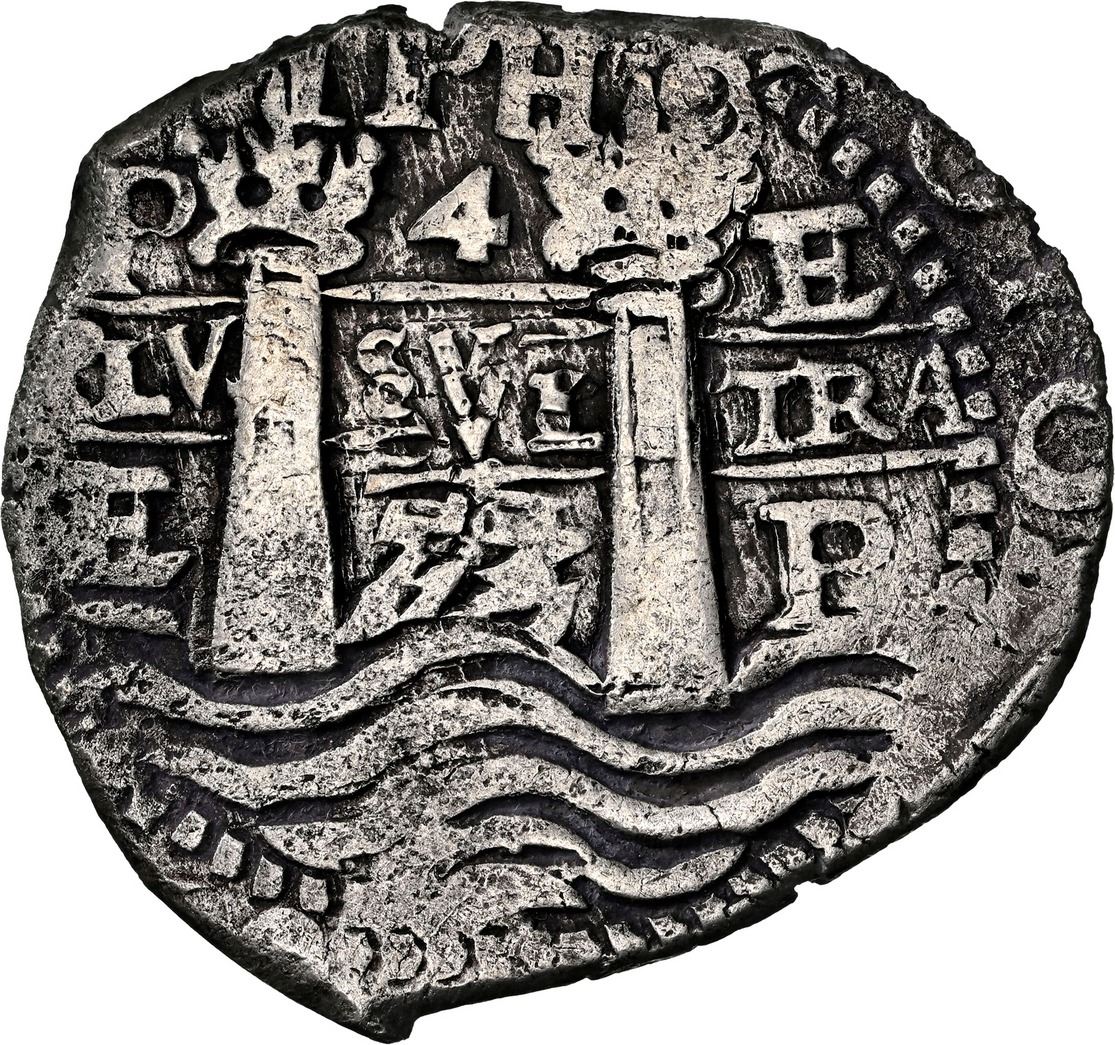 BOLIVIA, Potosí, cob 4 reales, 1653/2 E, 1-PH-6 at top, rare, NGC XF details / saltwater damage (Shipwreck Blue Label), ex-Zbar. S-P37a; KM-unl (18 for type); Cal-unl (Type 282). 12.18 grams. Very bold full pillars-and-waves with all interior elements visible including the overdate, also full cross with second date below (no overdate), bold king's ordinal IIII in legend, minimal surface corrosion, contrastingly toned. Pedigreed to the Jack Zbar Collection (stated on label). Recovered from: Maravillas, sunk in 1656 off Grand Bahama Island