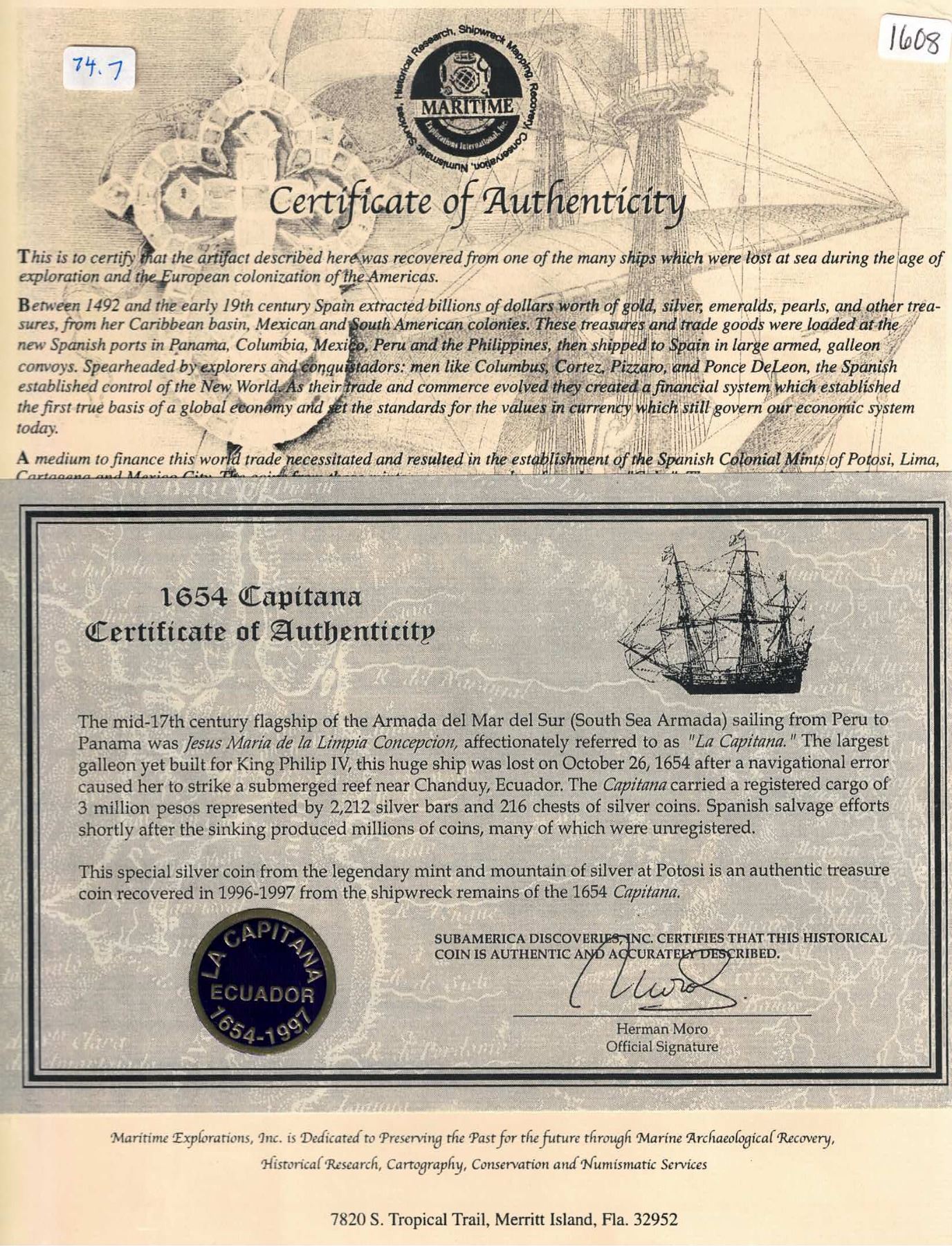 BOLIVIA, Potosí, cob 4 reales, 1653 E, 1-PH-6 at top. S-P37a; KM-18; Cal-1114. 6.34 grams. Silvery and thin from heavy corrosion but with a fair amount of detail including clear date and assayer on the pillars side, some off-center cross with king's ordinal visible in legend, scarce variety. With original Herman Moro and Joel Ruth/Lou Ullian certificates, plus photo-certificate. Recovered from: Capitana, sunk in 1654 off Chanduy, Ecuador