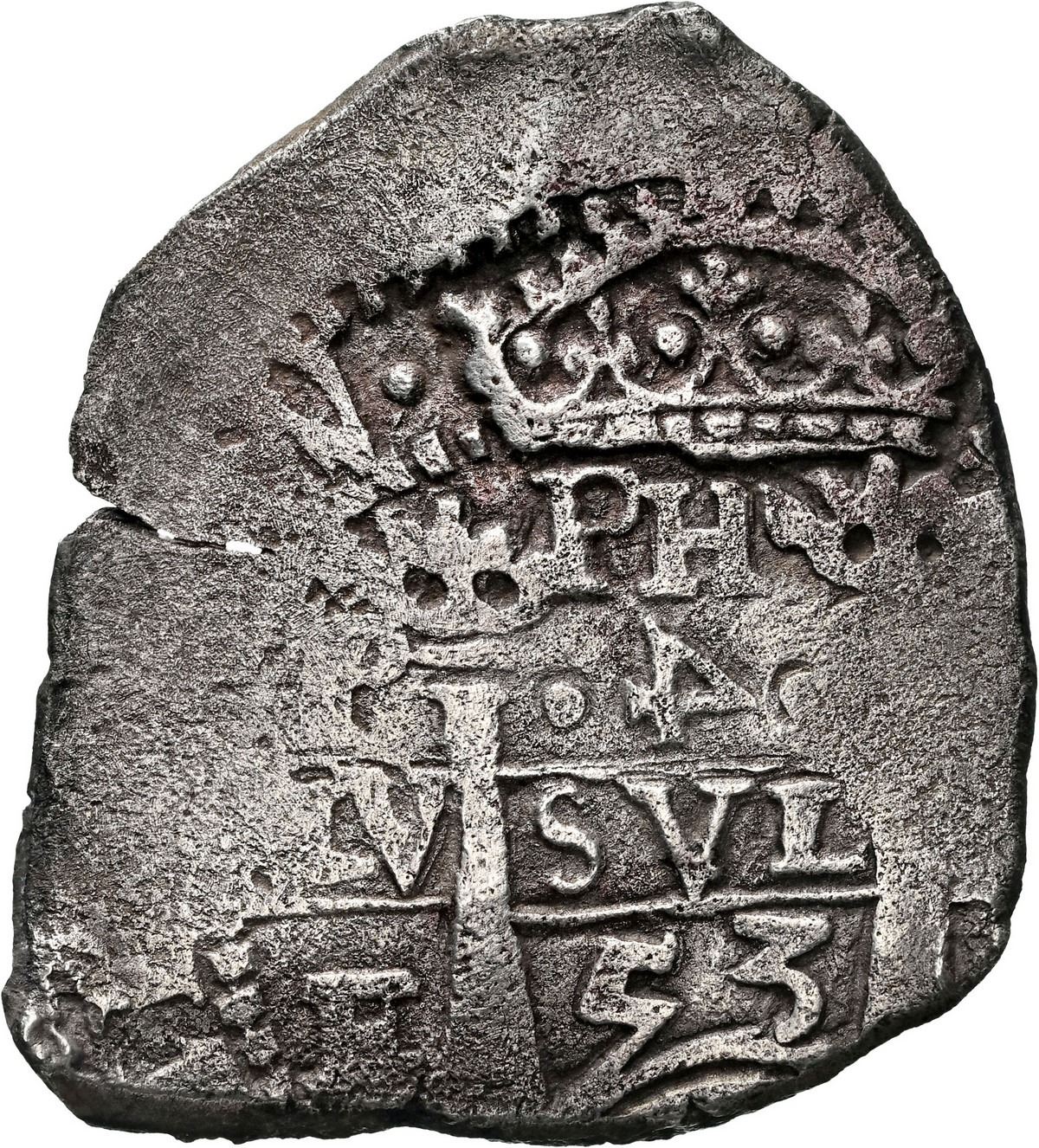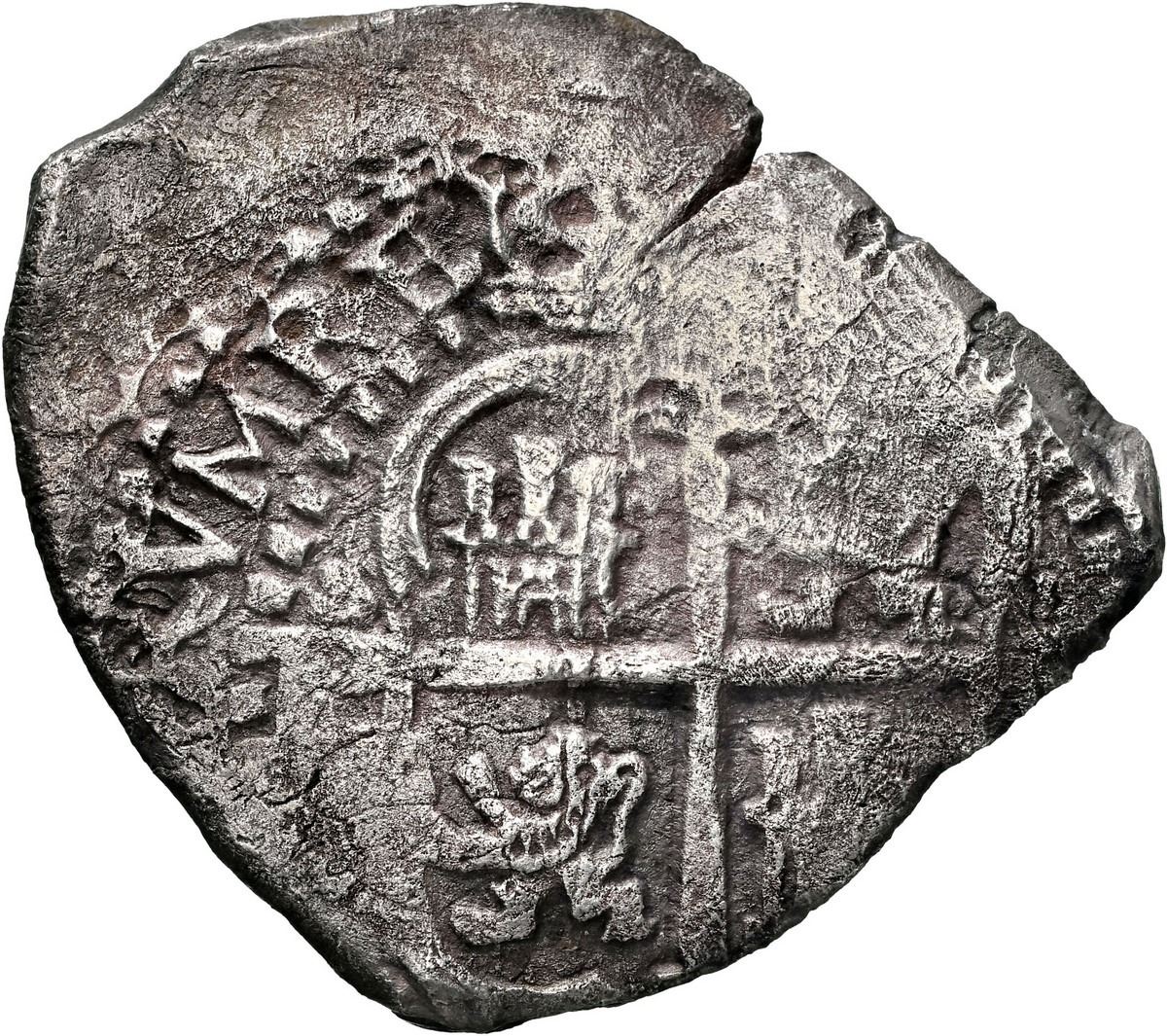 BOLIVIA, Potosí, cob 4 reales, 1653 E, retrograde denomination 4, PH at top, NGC XF details / saltwater damage (Shipwreck Blue Label), ex-Zbar. S-P37a; KM-18; Cal-1116. 12.39 grams. Odd-shaped flan with choice full crown above off-center pillars showing full PH, denomination, and date, the cross also full and off-center, some flatness and light corrosion in peripheries, nicely toned. Pedigreed to the Jack Zbar Collection (stated on label), with his tag. Recovered from: Maravillas, sunk in 1656 off Grand Bahama Island