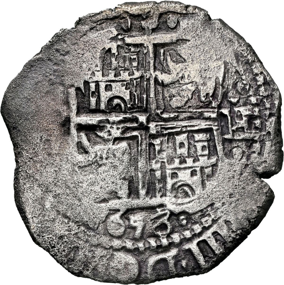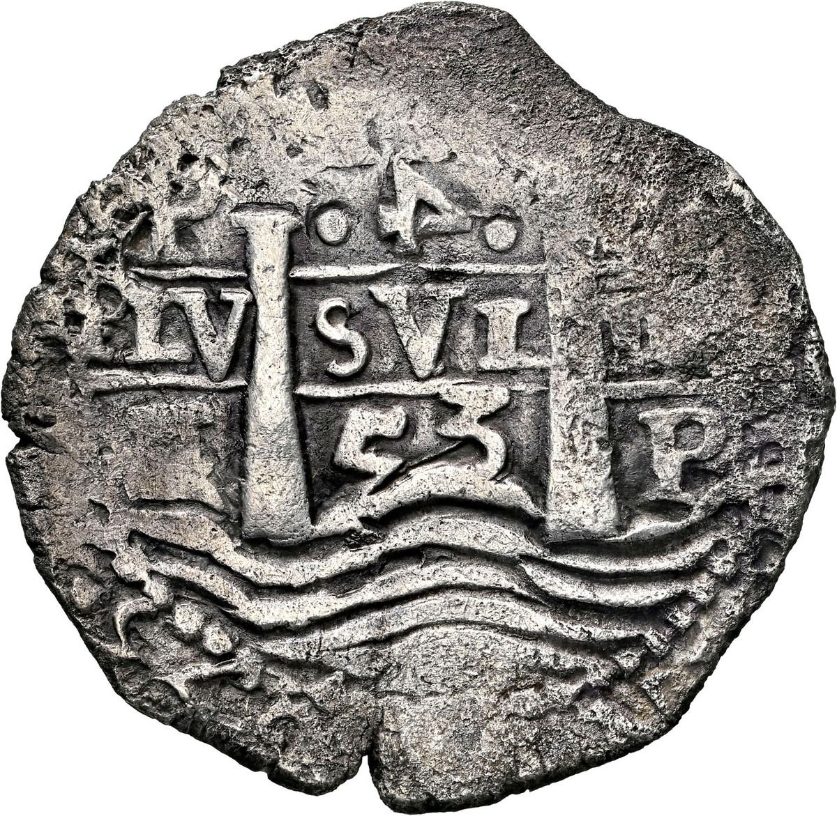 BOLIVIA, Potosí, cob 4 reales, 1653 E, retrograde denomination 4, PH at top, •pomegranate• above cross, NGC XF details / sea salvaged (Shipwreck Blue Label), ex-Zbar. S-P37a; KM-18; Cal-1116. 11.88 grams. Full pillars and very bold full waves with two dates on that side, bold retrograde-4 denomination between dots, full but doubled cross with third date below (three digits), king's ordinal IIII in legend, some flat spots and light surface corrosion, contrasting toning. Pedigreed to the Jack Zbar Collection (stated on label), with his tag. Recovered from: Maravillas, sunk in 1656 off Grand Bahama Island