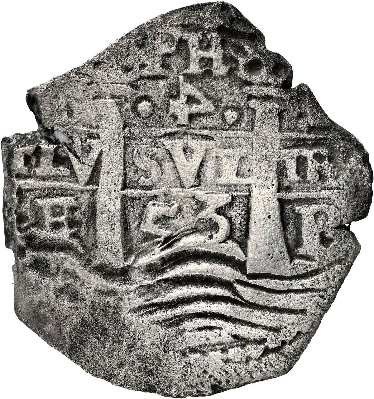 BOLIVIA, Potosí, cob 4 reales, 1653 E, retrograde denomination 4, PH at top, •pomegranate• above cross, NGC VF details / sea salvaged (Shipwreck Blue Label), ex-Zbar. S-P37a; KM-18; Cal-1116. 10.50 grams. Good full pillars-and-waves with clear PH, denomination, and date, also good full cross with second date below, contrastingly toned, light peripheral corrosion. Pedigreed to the Jack Zbar Collection (stated on label), with his tag. Recovered from: Maravillas, sunk in 1656 off Grand Bahama Island