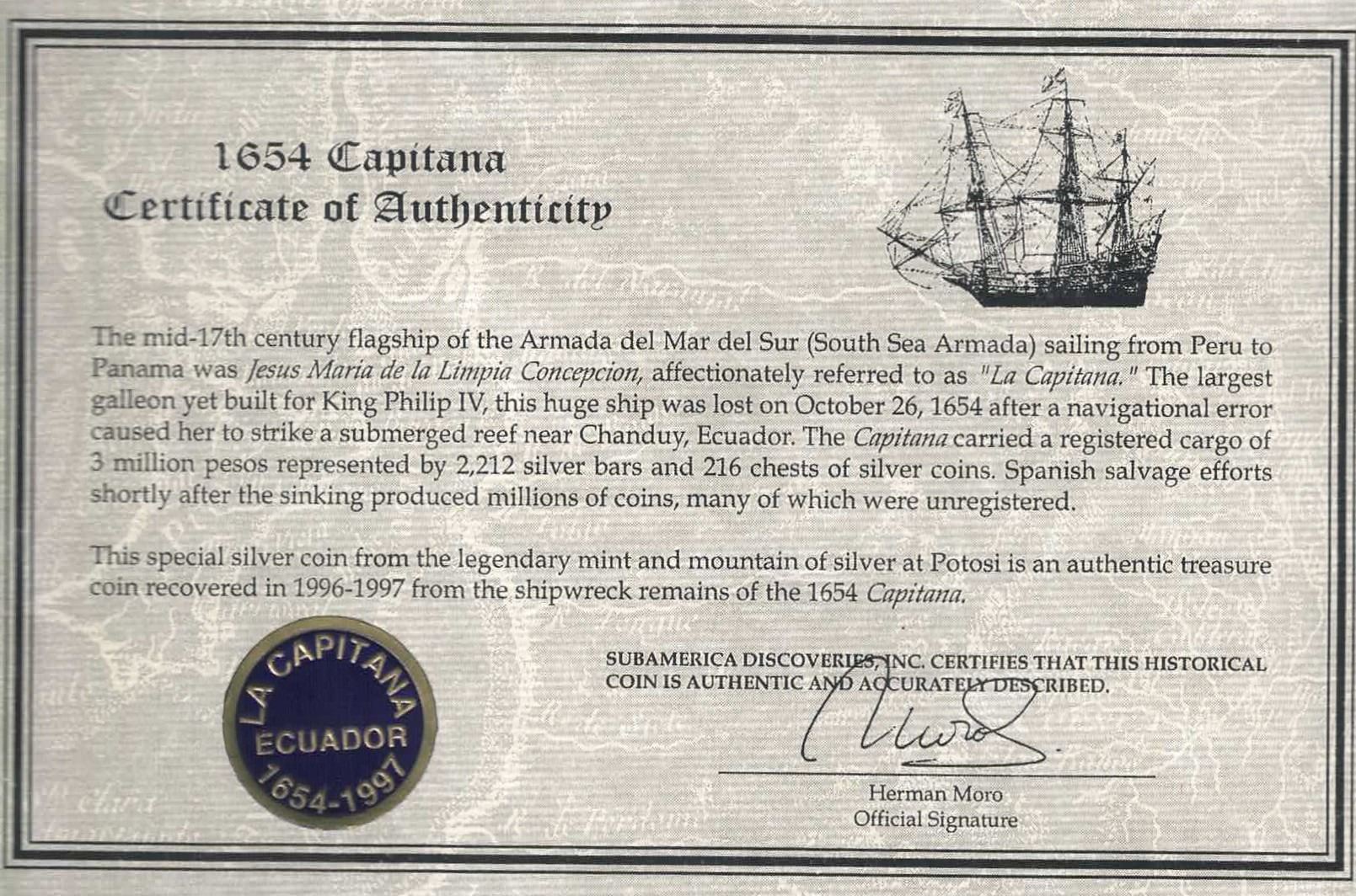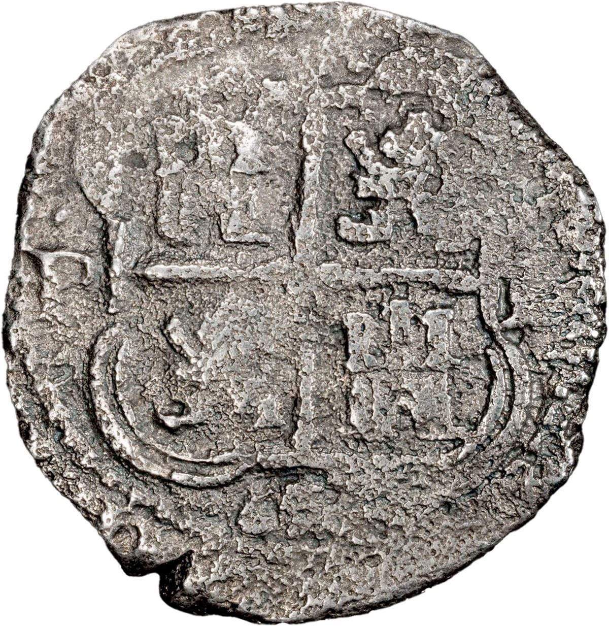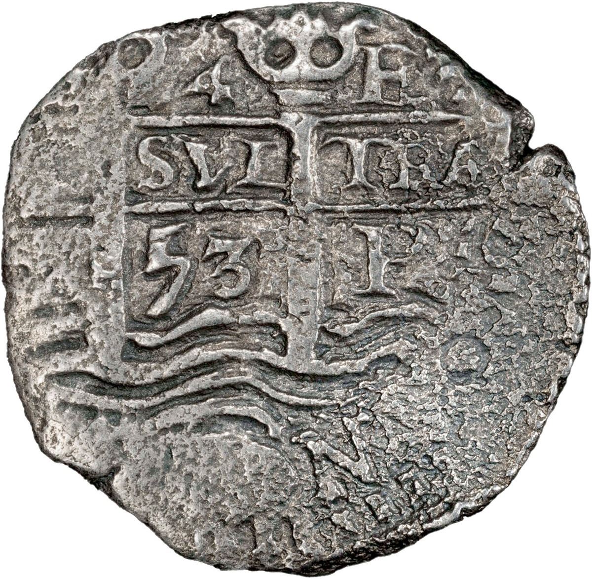 BOLIVIA, Potosí, cob 4 reales, 1653 E, tiny denomination 4, PCGS VF details / saltwater damage. S-P37a; KM-18. 11.78 grams. Full but off-center pillars-and-waves with full, small denomination 4 (probably a 2R punch), well-centered full cross, light to moderate surface corrosion, nicely toned. Note: PCGS label does not mention shipwreck. With original (generic) certificate from Herman Moro. Recovered from: Capitana, sunk in 1654 off Chanduy, Ecuador