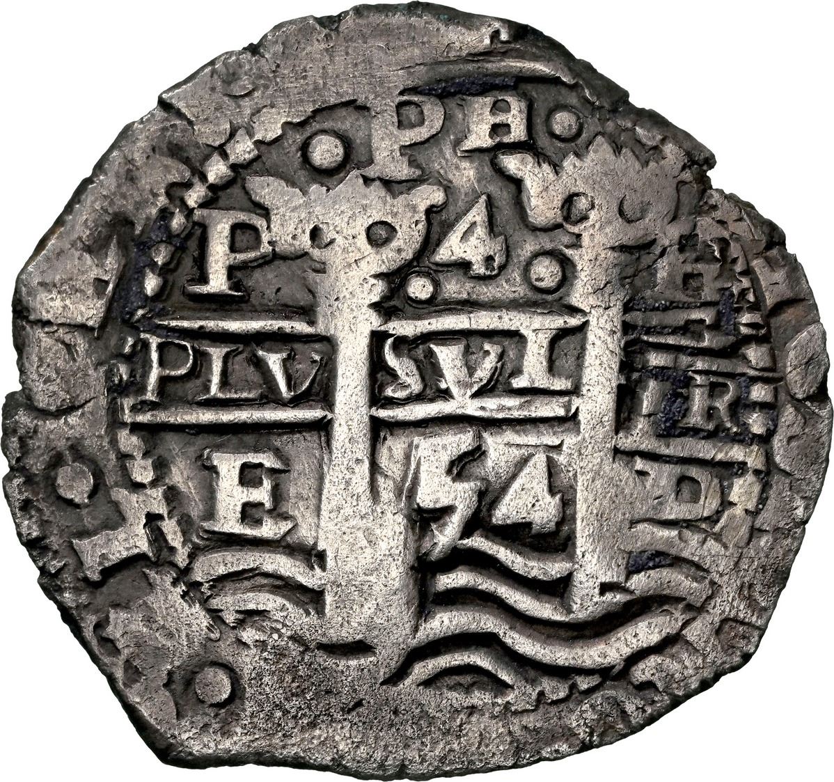 BOLIVIA, Potosí, cob 4 reales, 1654 E, •PH• at top, •4• above cross, NGC XF details / saltwater damage (Shipwreck Blue Label), ex-Zbar. S-P37a; KM-18; Cal-1117. 13.49 grams. Broad flan with excellent full cross-lions-castles, full but slightly doubled pillars-and-waves, two clear dates and mintmarks and assayers, nicely toned, with corrosion only on small parts of edge. Pedigreed to the Jack Zbar Collection (stated on label). Recovered from: Maravillas, sunk in 1656 off Grand Bahama Island