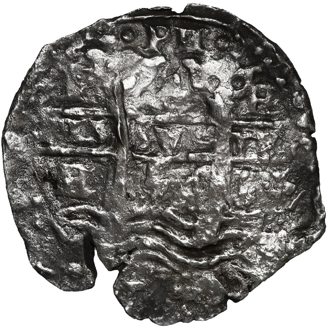 BOLIVIA, Potosí, cob 4 reales, 1654 E, •PH• at top, •pomegranate• above cross, NGC XF details / sea salvaged (Shipwreck Blue Label). S-P37a; KM-18; Cal-1117. 11.46 grams. Full but corroded pillars and cross, with nearly full king's name and ordinal, two dates, edge-split, deep old scratch on left pillar. With original JWI photo-certificate signed by Dominic Addario. Recovered from: “Jupiter Wreck” (San Miguel Arcángel), sunk in 1659 off the east coast of Florida