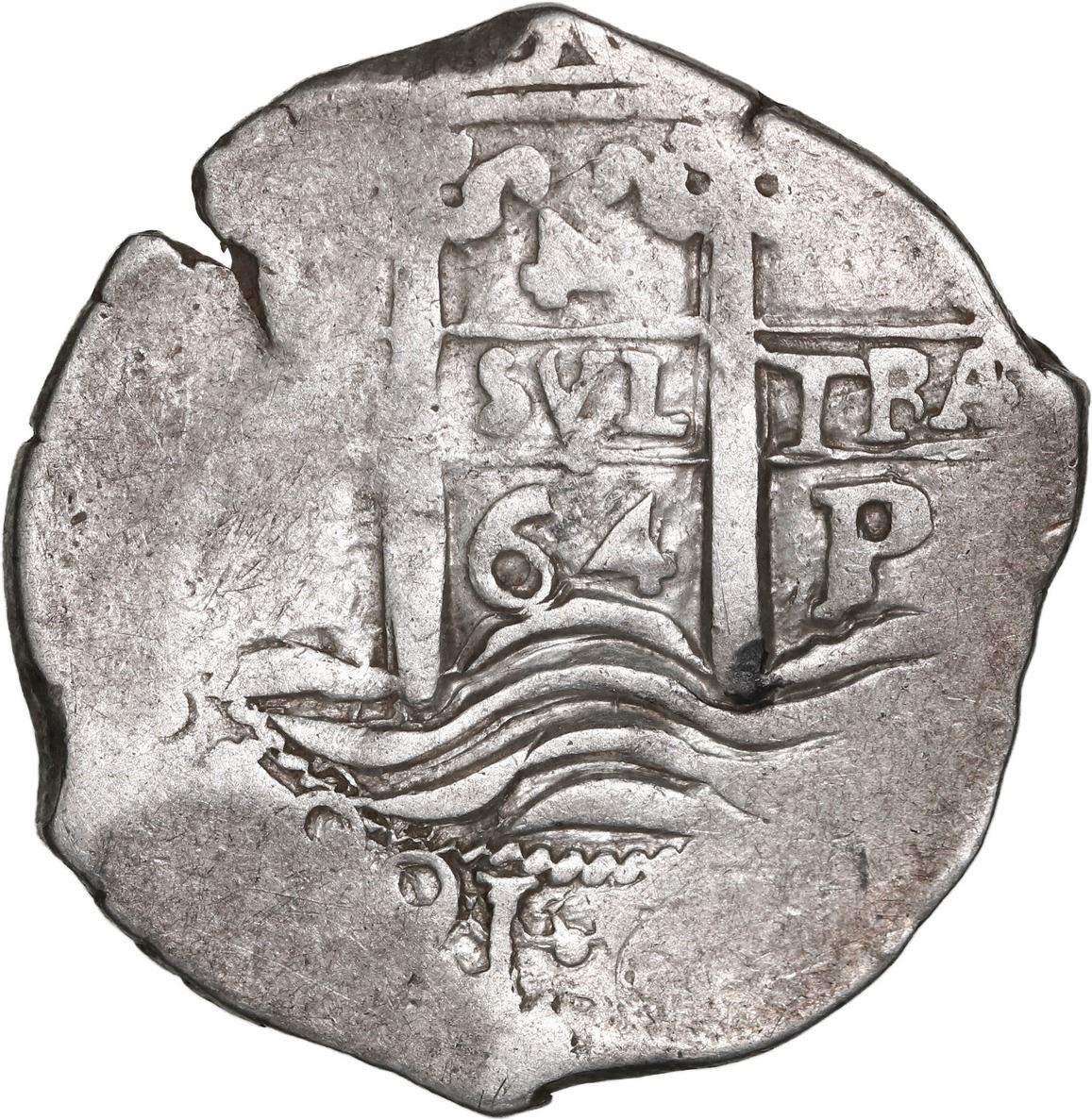 BOLIVIA, Potosí, cob 4 reales, 1664 E, retrograde denomination 4, very rare, ex-Ponte. S-P37a; KM-unl (18 for type); Cal-unl (Type 284). 13.40 grams. Silvery Fine with full but off-center pillars-and-waves displaying a clear retrograde denomination 4 (only the second we have seen after the Karon/Johnson specimen), two clear dates on that side plus a third bold 64 below off-center cross, much peripheral flatness and small edge-split. Pedigreed to the Luis R. Ponte Collection.
