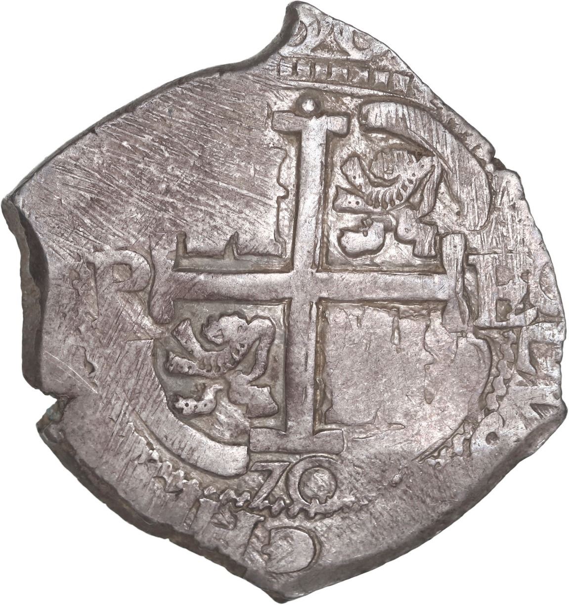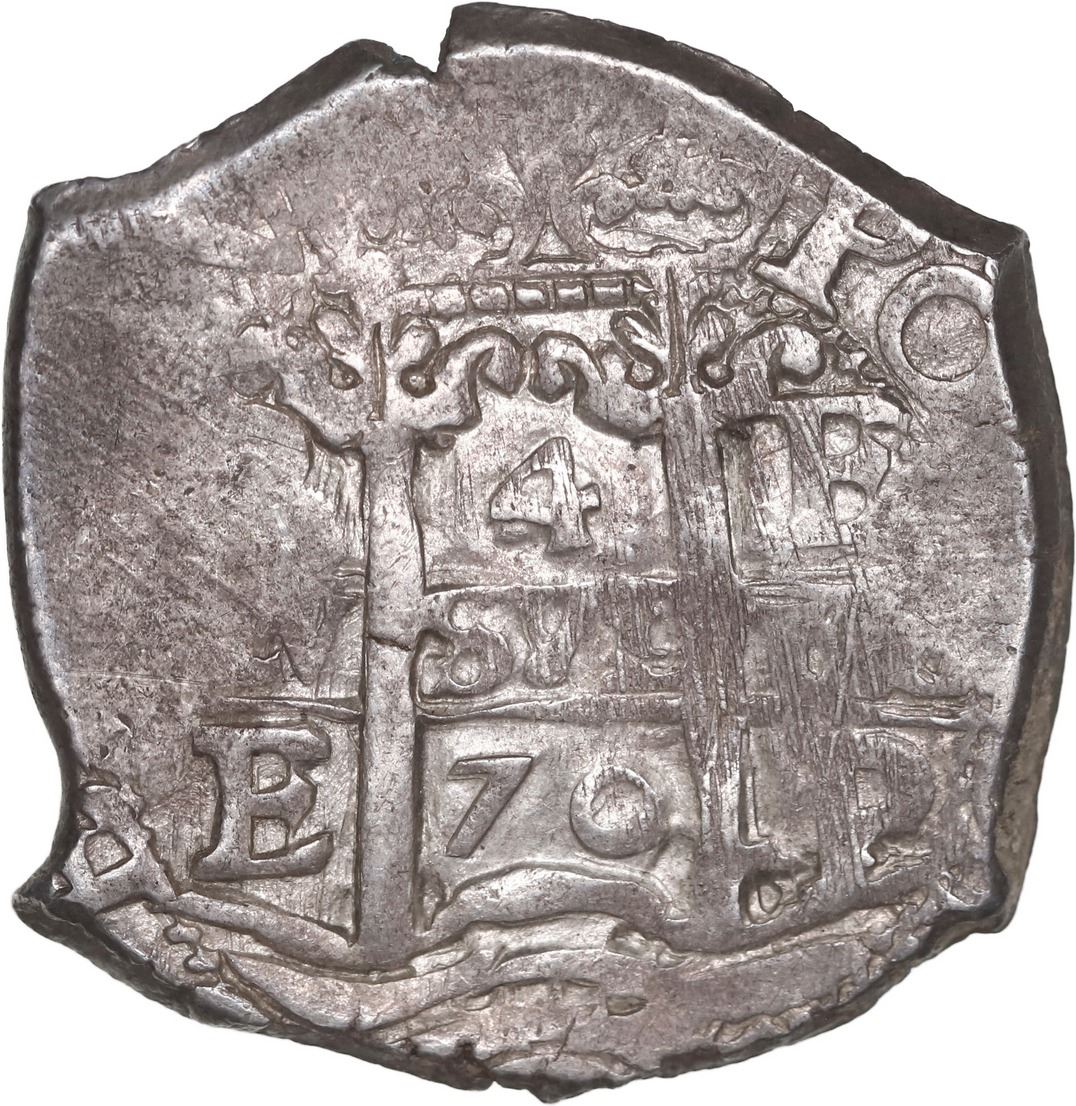 BOLIVIA, Potosí, cob 4 reales, 1670 E, ex-Ponte. S-P37b; KM-25; Cal-513. 13.91 grams. Lustrous AU+ with two full two-digit dates (one inside 100% full pillars-and-waves, the other below full but slightly weaker cross-lions-castles), parts of all three mintmarks and assayers, incipient toning on cross side. Pedigreed to the Luis R. Ponte Collection.