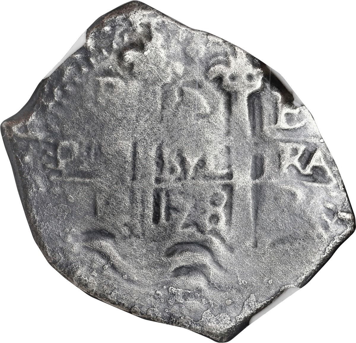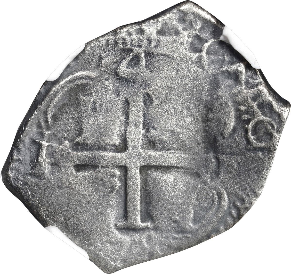 BOLIVIA, Potosí, cob 4 reales, 1678 E, retrograde denomination 4, NGC Sea Salvaged (Shipwreck Blue Label). S-P37b; KM-unl (25 for type); Cal-unl (Type 94). 7.12 grams. Oddly barrel-shaped flan with full but weak pillars-and-waves and cross, clear retrograde-4 denomination (not mentioned on label), two dates, light toning, typically worn from corrosion. With photo-certificate. Recovered from: Consolación, sunk in 1681 off Santa Clara Island, Ecuador